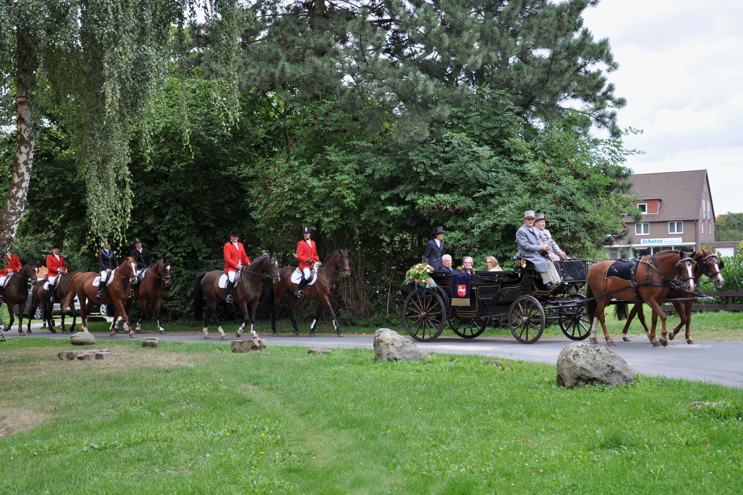 Sowohl der 1. Vorsitzende des RV-Wilkenburg als auch seine beiden Stellvertreter hatten sich zu Ehren des Brautpaares bereit erklärt, die standesgemäße Begleitung der Kutsche anzuführen. Aber auch die Jugend war vertreten: Juliane Kallis und Lisa Borsum, Enkelin des Hochzeitspaares, begleiteten die Kutsche ebenso wie Peter Meisel, der als Maître de Plaisir die Fahrt organisiert hatte.