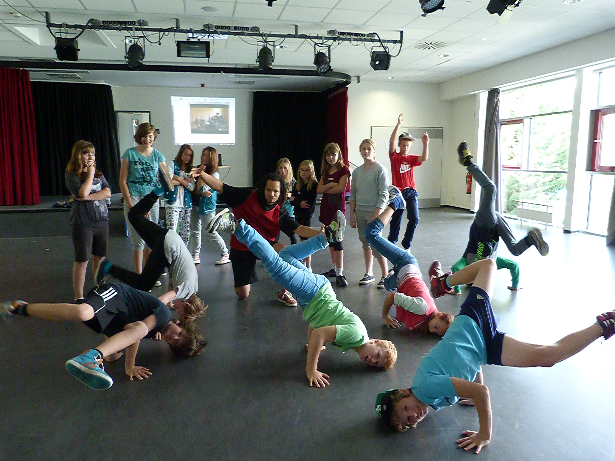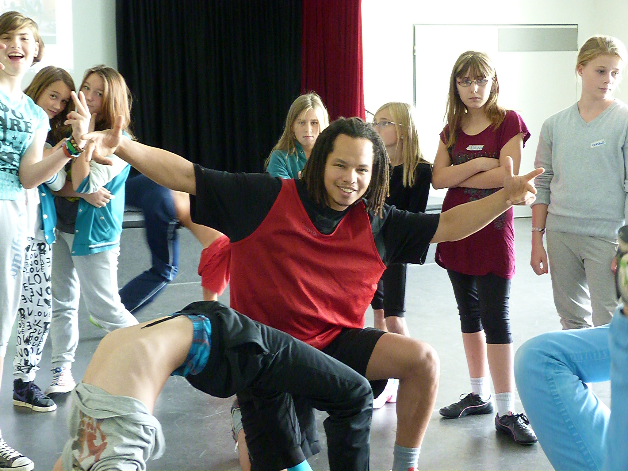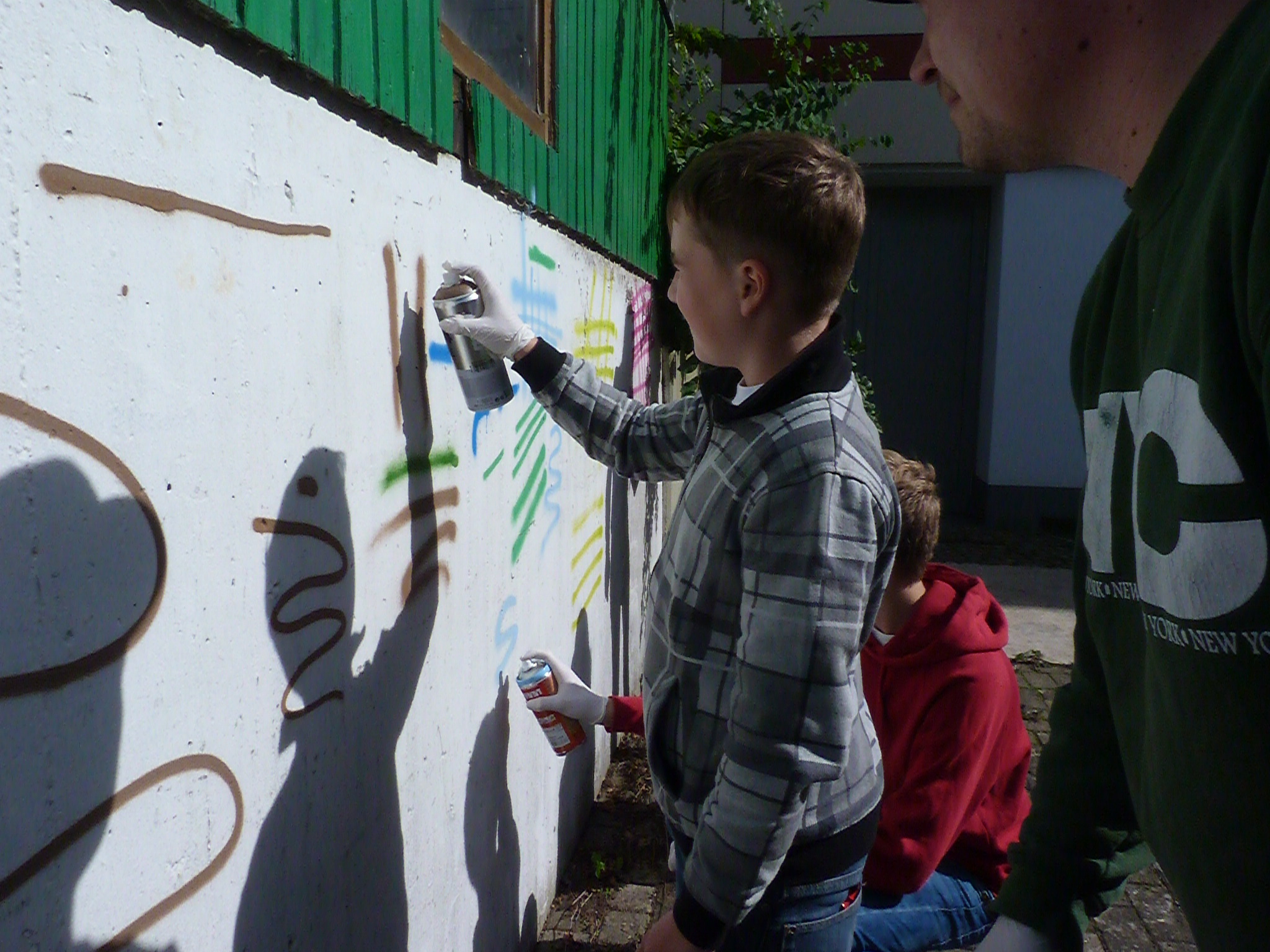 Im großen Jugi-Raum hat Breakdancer DefJef seine Schüler um sich geschart. Sie dürfen sich an den verschiedensten Tanzschritten versuchen, einige von ihnen traten heute beim Gemeindefest von Trinitatis auf. Beim Graffitiworkshop bekommen die Teilnehmer eine Einführung in die Kunst des Sprayens; Jonas Wömpner und Benny Altner geben Tipps zum richtigen Gebrauch der Farbdosen.