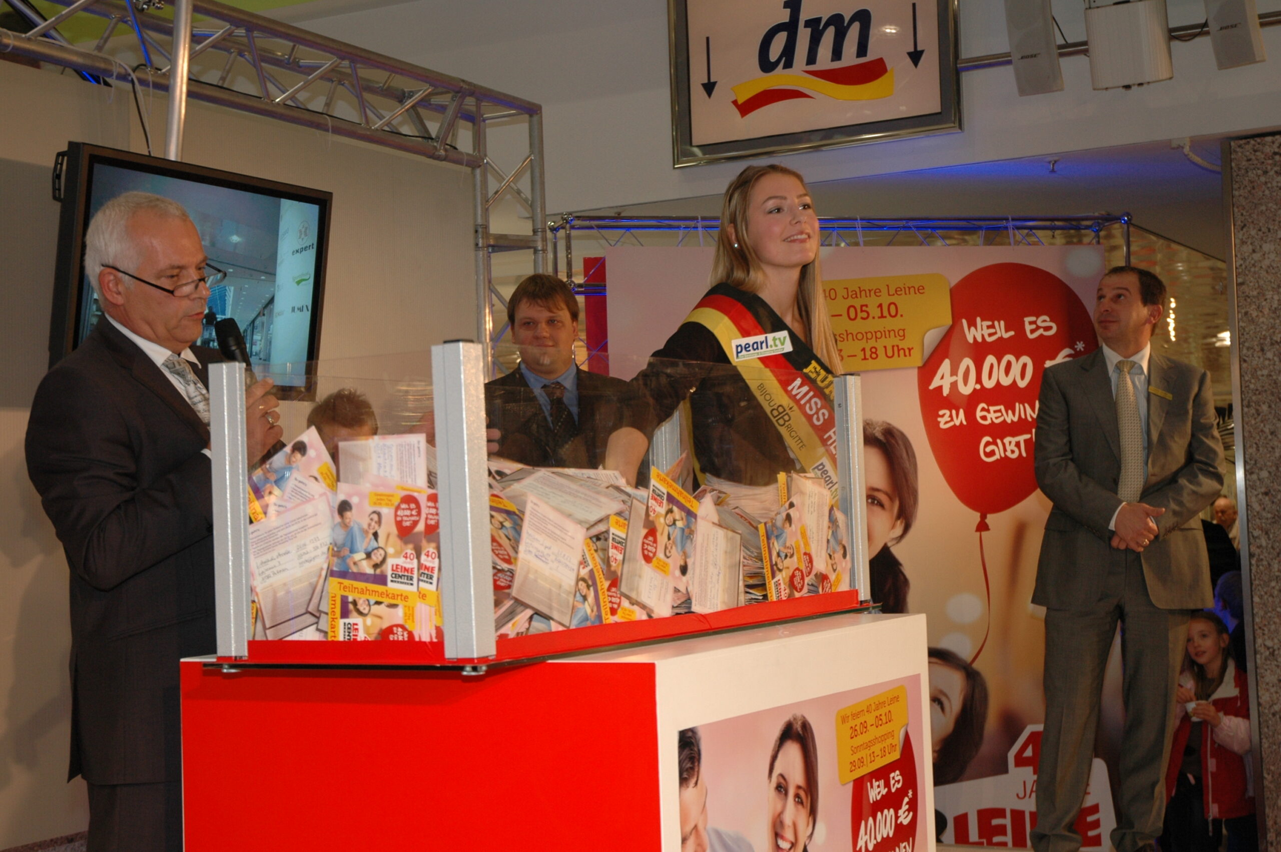 Insgesamt 10 Tage lang feierte das Leine-Center sein 40-jähriges Jubiläum mit verschiedensten Attraktionen und Auftritten in der Ladenstraße. Mit der Verlosung von vier Shopping-Touren im Leine-Center für jeweils 10 000 Euro fanden die Feierlichkeiten heute Abend ihren Höhepunkt.. Etwa 3000 Besucher warteten gespannt auf die Ziehung der vier Gewinner. Die amtierende "Miss Herbst" Laura Friedrich war als Glücksfee anwesend und zog die vier Gewinner aus der mit etwa 30 000 Karten gefüllten Losbox.