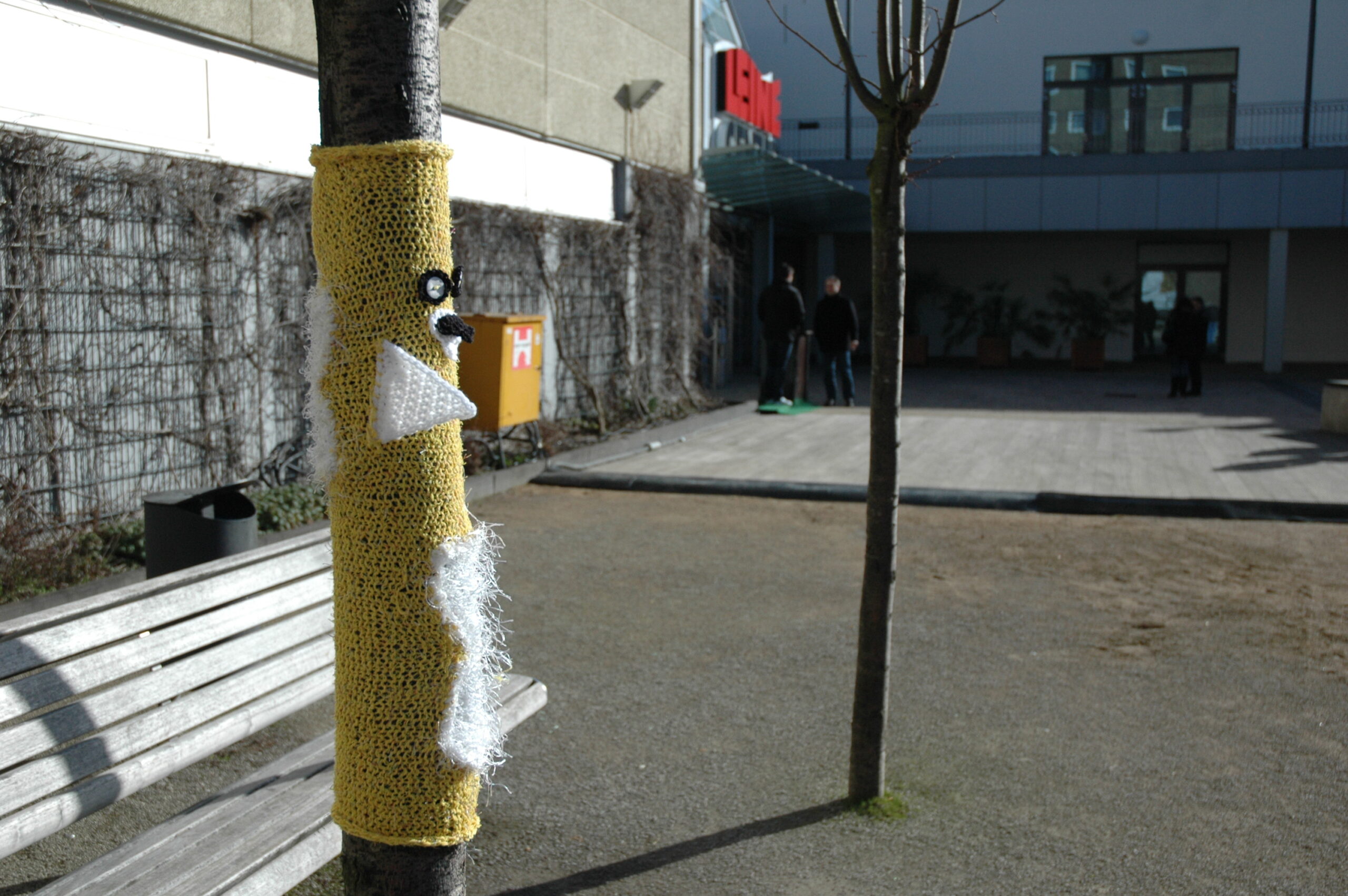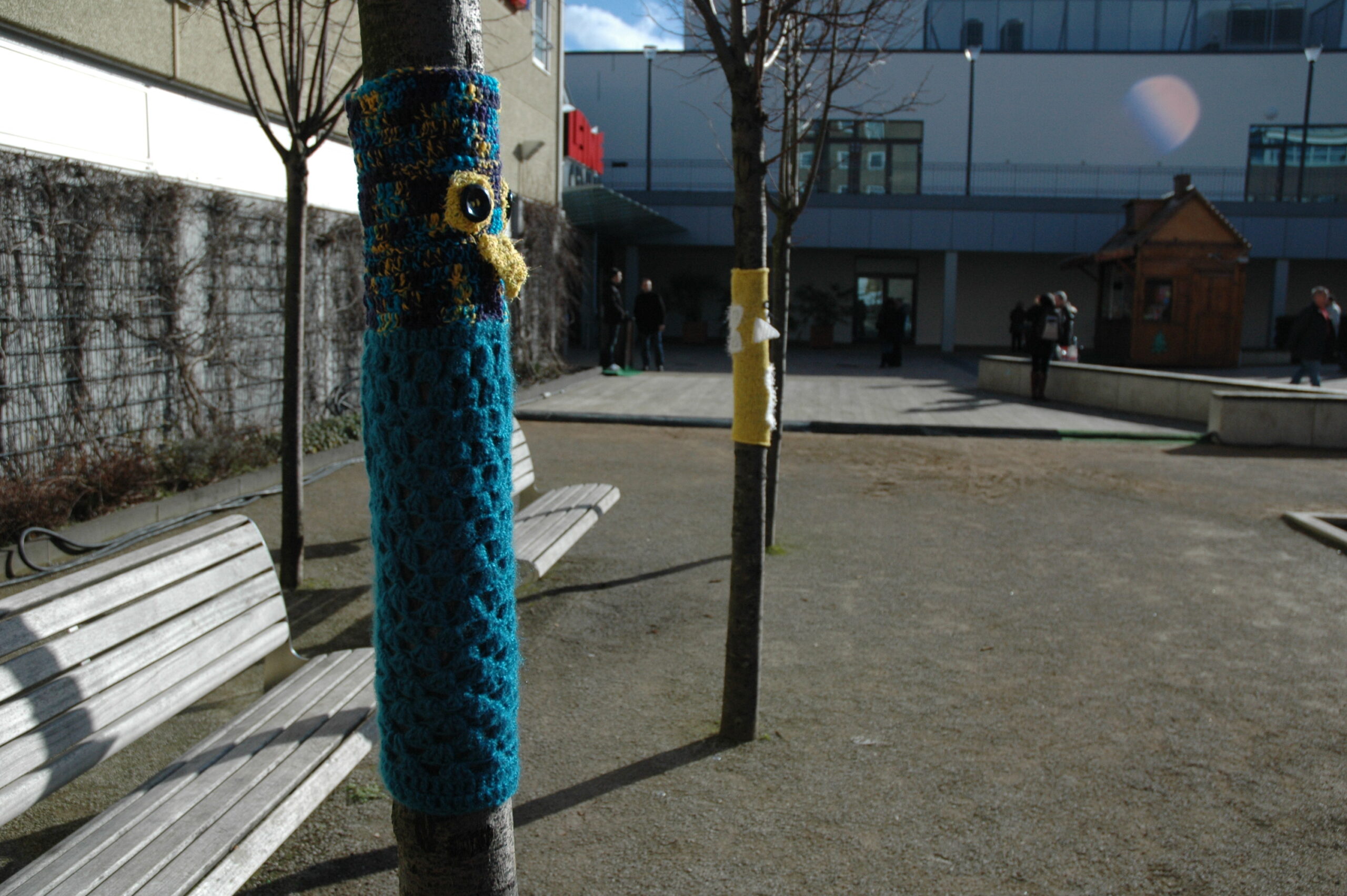 Strick und Häkel ist zur Zeit wieder stark im Trend und das Bedürfnis von Menschen aus allen Altersgruppen, dieses „alte Handwerk“ zu lernen und modisch umzusetzen, ist sehr groß. Die Jugendkunstschule Jukus möchte daher für alle Interessierten, aus den verschiedensten Altersstufen einen Kursus unter fachkundiger Leitung anbieten, in dem gemeinsam verschiedene Gestaltungstechniken kennengelernt und erlernt werden können. Um auf das neue Angebot hinzuweisen, haben die Verantwortlichen heute eine Straßenkunst-Aktion auf dem Marktplatz und dem Center-Vorplatz gestartet.. Auf dem Marktplatz wurde wir ein Baum bestrickt und auch ein Mülleimer mit einem "Strickkleid" eingepackt. Auf dem Center-Vorplatz wurden wir drei Bäume und zwei Mülleimer bestrickt. Die Objekte werden etwa drei Wochen dort bleiben.