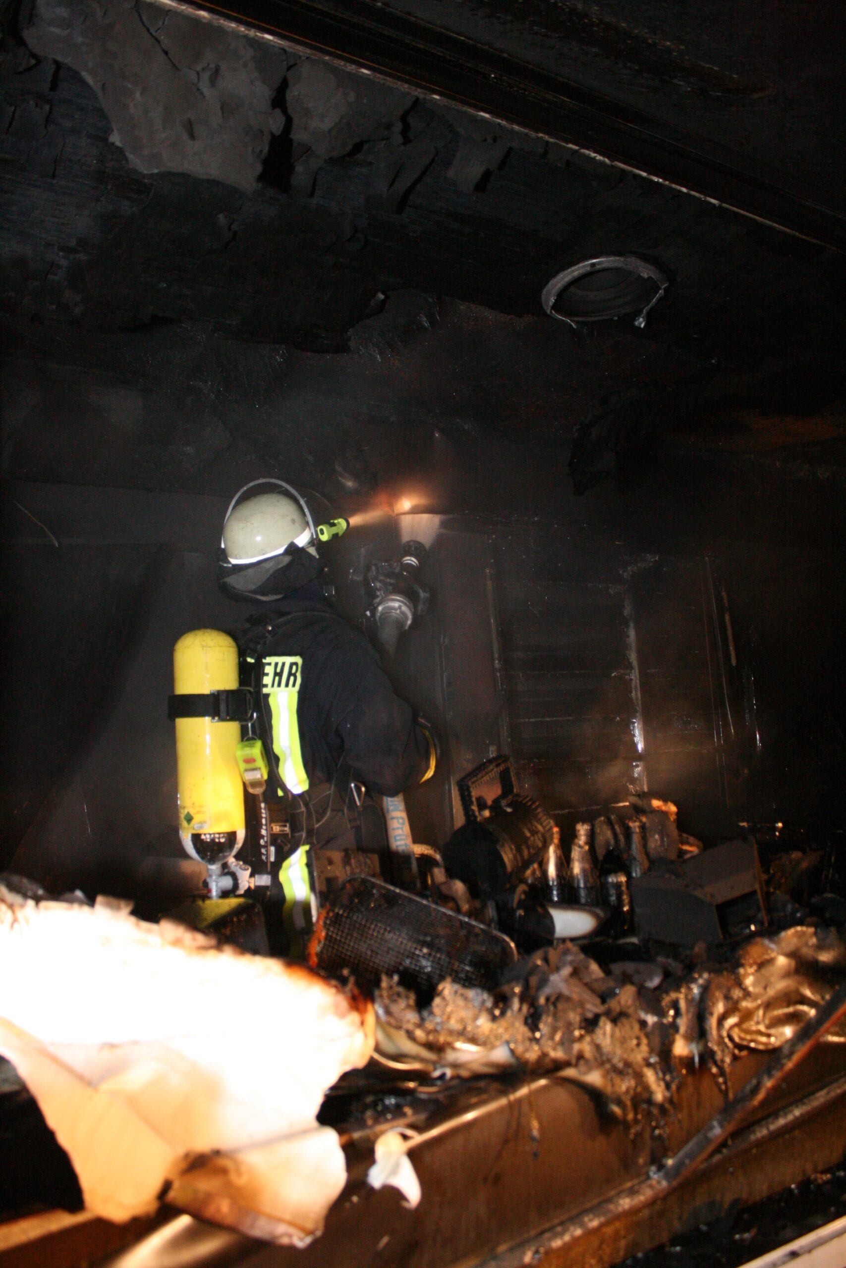 Zunächst löschte die Feuerwehr den brennenden Wagen von außen mit Schaum und Wasser aus zwei Strahlrohren. Nachdem drei große Propangasflaschen geborgen waren, erfolgten Nachlöscharbeiten im Inneren des Anhängers. Die Lösch- und Aufräumarbeiten waren gegen 2.50 Uhr beendet. Zur Brandursache hat die Polizei Ermittlungen aufgenommen.