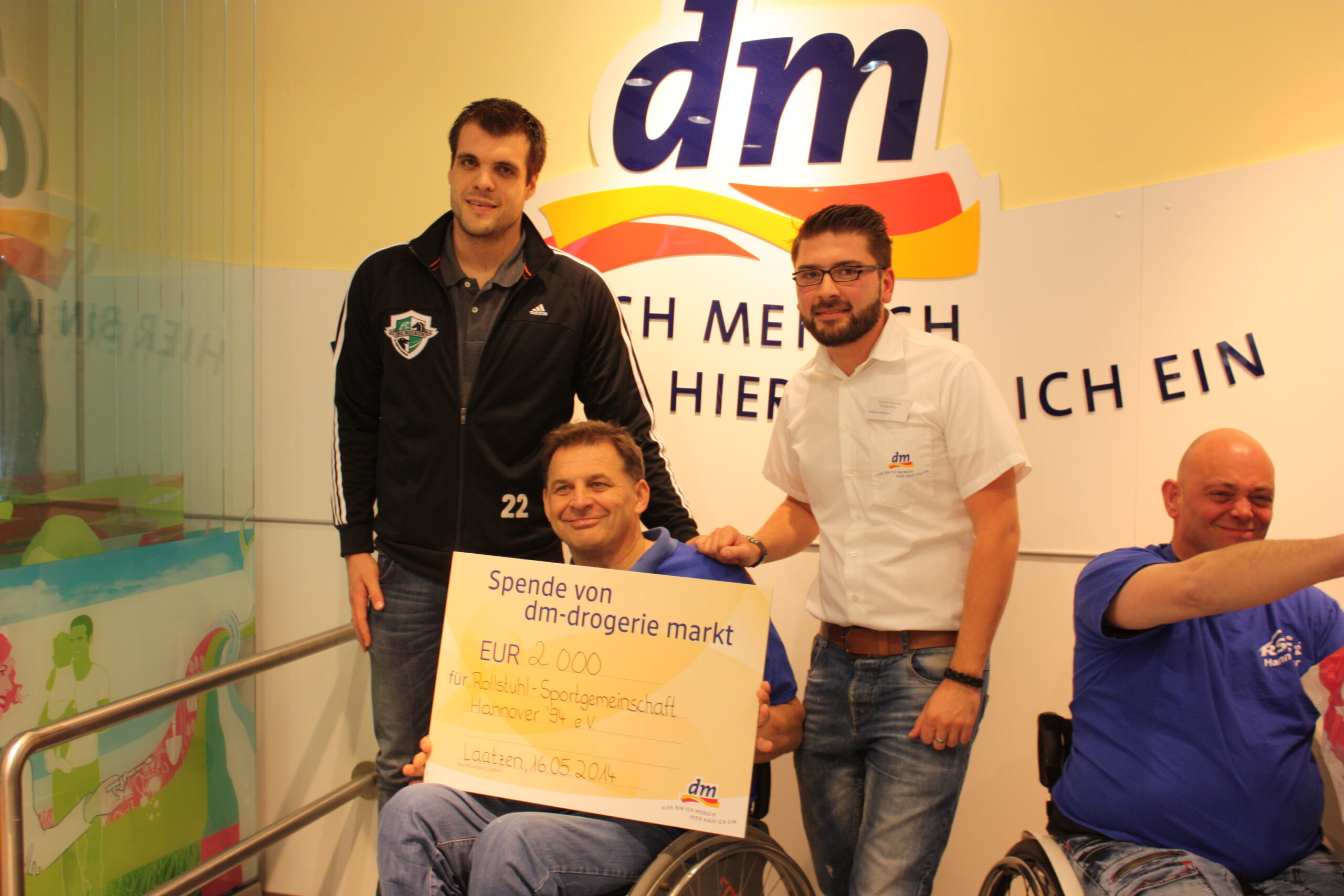 Eine gelungene Spendenaktion hat heute die dm-Filiale im Leine-Center veranstaltet. Handball-Profi Vasco Sevaljevic von den Hannover Recken kassierte eine Stunde lang im Drogeriemarkt, den eingenommenen Betrag rundete dm-Filialleiter Sascha Konopka auf 2000 Euro auf und spendete das Geld an die Rollstuhl-Sportgemeinschaft (RSG) Hannover. . Konopka und der RSG-Vorsitzende Detlef Zinke kennen sich bereits seit vielen Jahren und hatten gemeinsam überlegt, wie eine Spendenaktion erfolgreich gestaltet werden könnte. Da Zinke gute Kontakte in Hannovers Sportszene hat, konnte er Vasco Sevaljevic von den Hannover Recken überzeugen, mitzumachen. Im Gegenzug spendete der Drogeriemarkt 2000 Euro an die RSG.