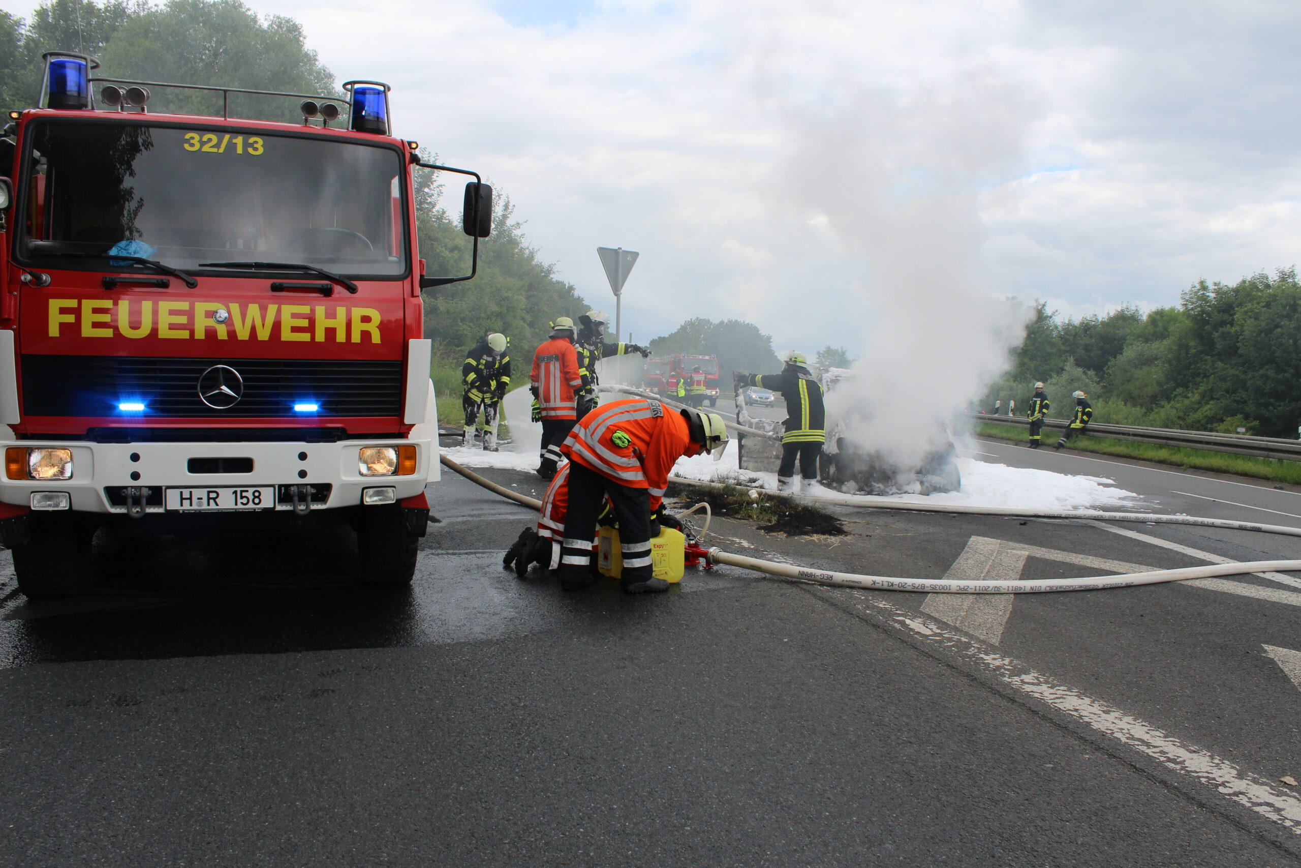 Zu einem brennenden PKW wurde die Ortsfeuerwehr Rethen heute Mittag auf die Bundesstraße 6 alarmiert. Die schwarze Rauchsäule des kurz vor der Brücke der Bundesstraße 443 auf dem Seitenstreifen stehenden und in voller Ausdehnung brennenden Mercedes Vaneo konnten die anrückenden 15 Einsatzkräfte schon von Weitem sehen. . Die vier Insassen hatten das Fahrzeug glücklicherweise noch rechtzeitig verlassen und sich in Sicherheit bringen können. Sie blieben unverletzt. Die Helfer löschten das Feuer unter schwerem Atemschutz und Filtergeräten mit Schaum und Wasser. Eingesetzt wurden ein Mittelschaumrohr und ein C-Hohlstrahlrohr an der Schnellangriffseinrichtung des Tanklöschfahrzeugs. Der PKW brannte vollständig aus. Die Brandursache konnte bislang nicht geklärt werden, die Ermittler der Kriminalpolizei haben die Arbeit aufgenommen.