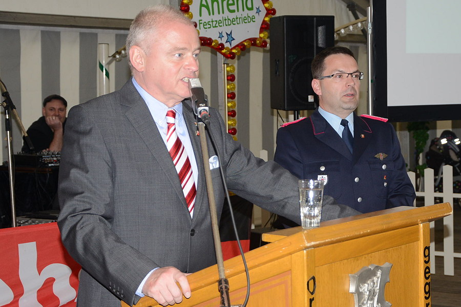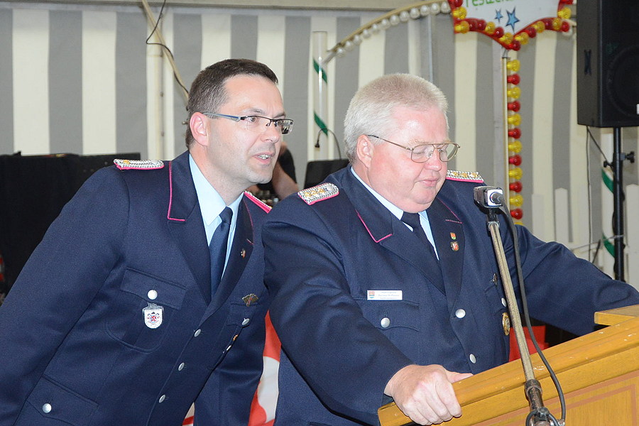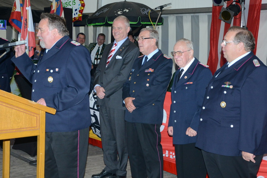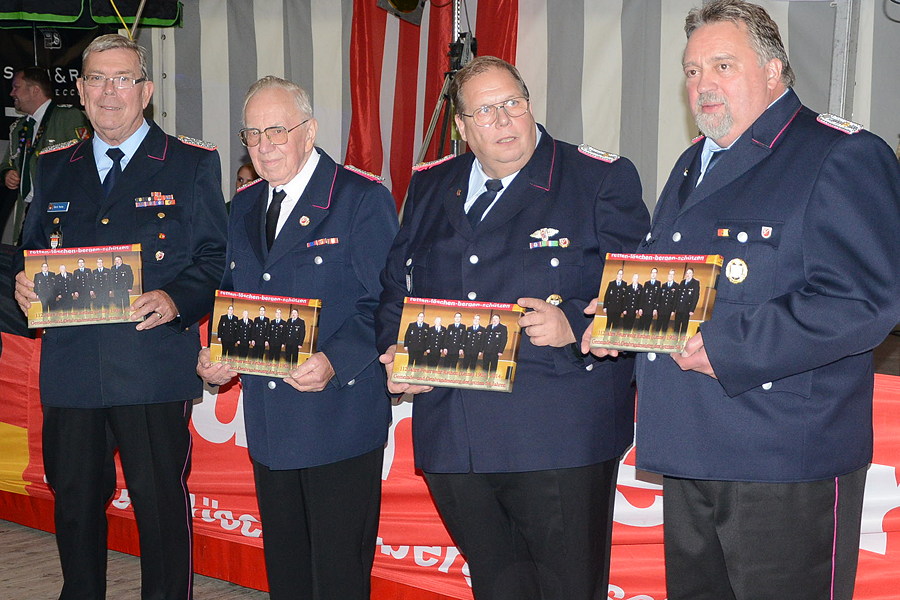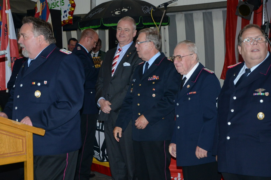Ehrungen haben gestern Abend im Mittelpunkt des Volks,-Schützen- und Feuerwehrfestes auf dem Festplatz auf der Sehlwiese gestanden, und Sänger des Rethener Männer-Quartetts brachten zum 112jährigen Jubiläum der Rethener Wehr ein Ständchen.. Regionsbrandmeister Karl-Heinz Mensing, Brandabschnittsleiter Eric Pahlke und Laatzens Stadtbrandmeister Hartmut Hoffmann hatten gestern Abend sprichwörtlich alle Hände voll zu tun. Aus Anlass der Feier – gemeinsam mit der Schützengesellschaft Rethen/Leine – zum 112. Jubniläum der Rethener Feuerwehr schüttelten sie zahlreiche Hände und verteilten Urkunden an verdiente sowie langjährige Mitgieder der Rethener Wehr.