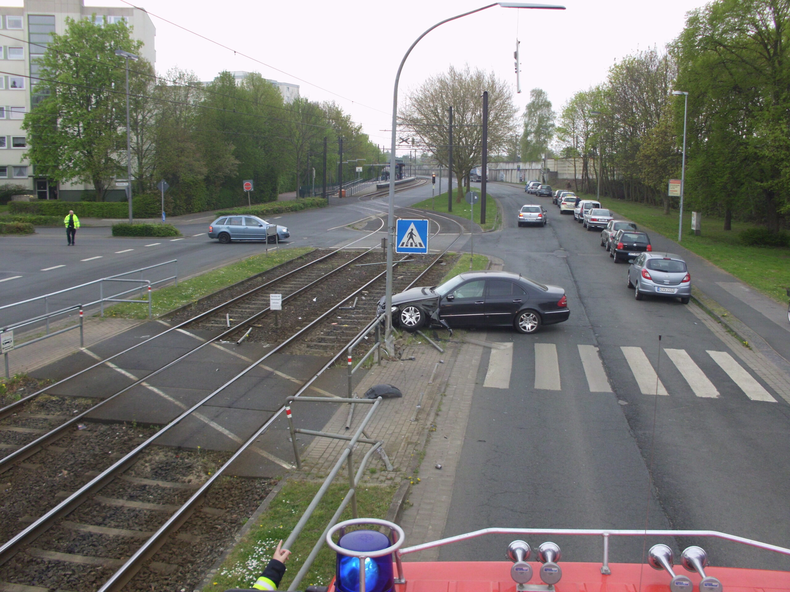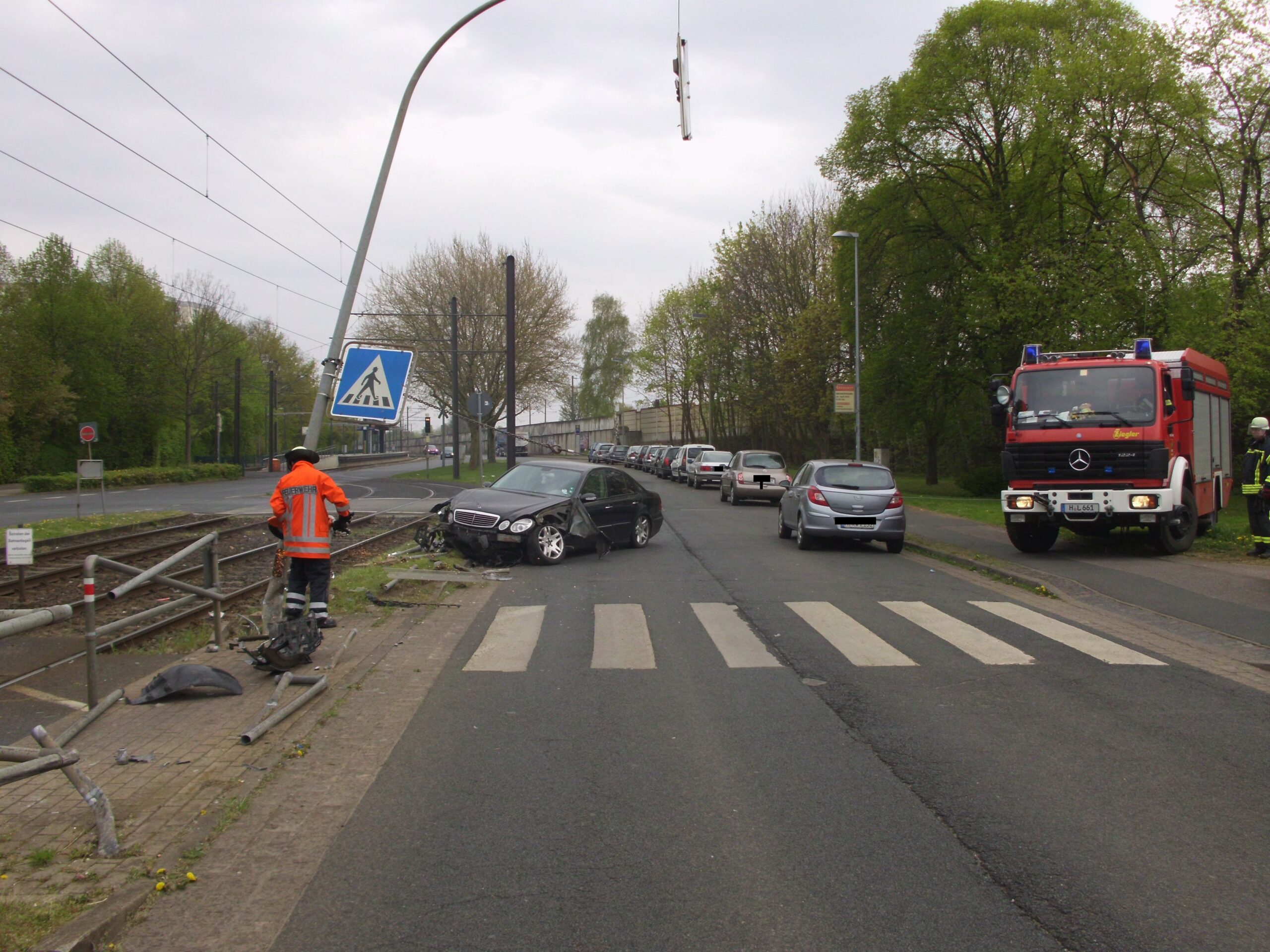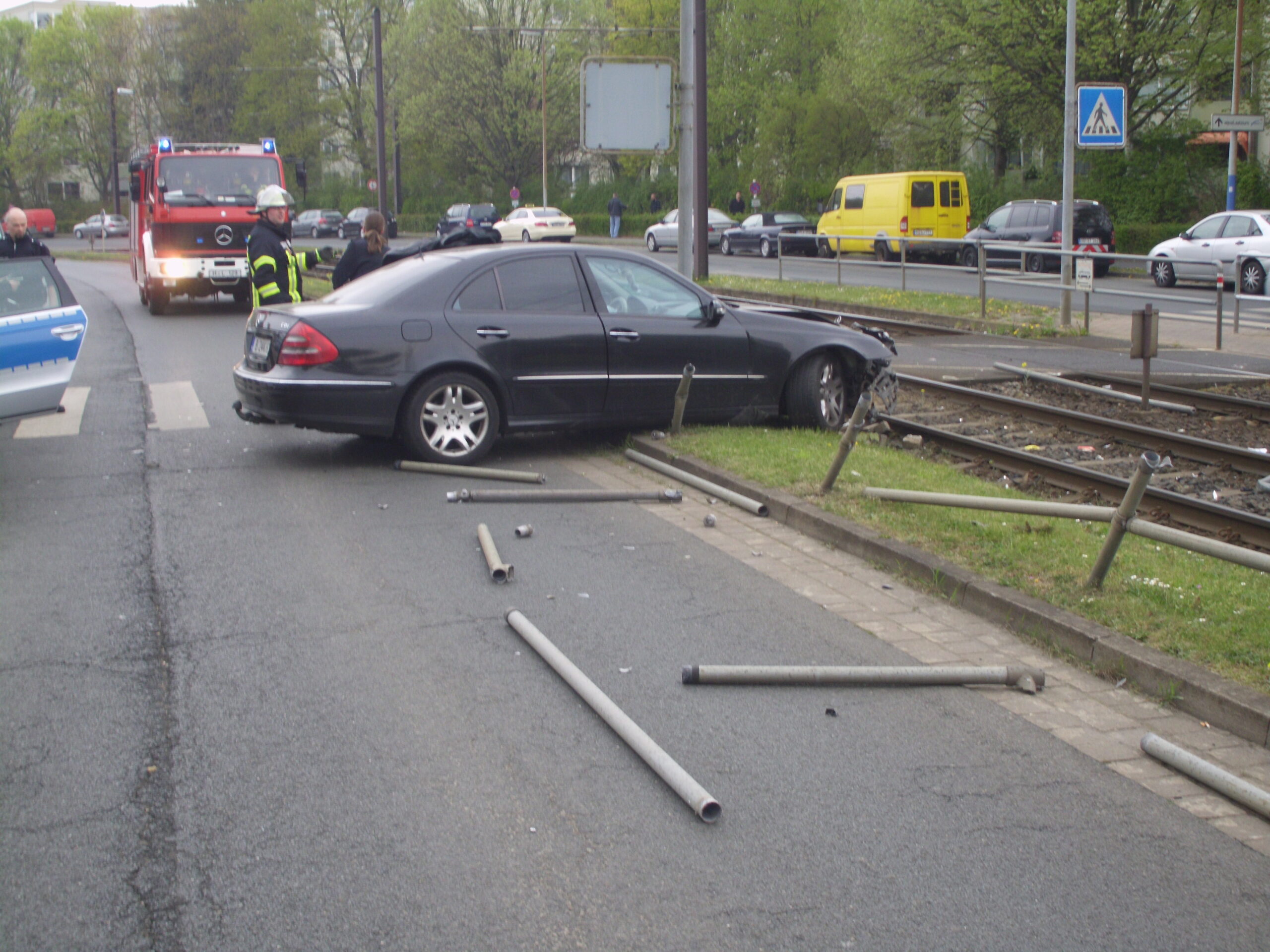 Genau zu diesem Zeitpunkt hatte sich auf der Hildesheimer Straße in Höhe Wülferoder Straße ein Verkehrsunfall ereignet. Von der Polizei wurde die Feuerwehr daraufhin beim Einrücken "umgeleitet". Ein schwarzer großer Mercedes war aus Hannover kommend in eine Laterne sowie die Gitterzäune des Fußgängerüberweges gefahren. Die Feuerwehr zog den PKW mit der Seilwinde des Rüstwagens aus den Trümmerteilen des Zaunes (siehe Foto). Außerdem wurden umhergeflogene Trümmerteile (Pflastersteine, Reste des Zaunes) eingesammelt.