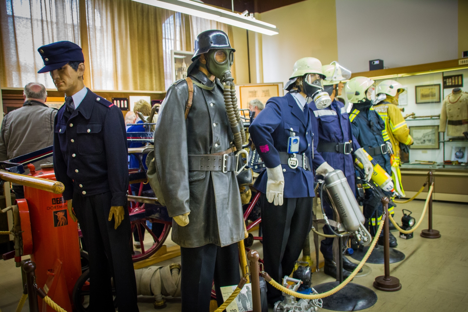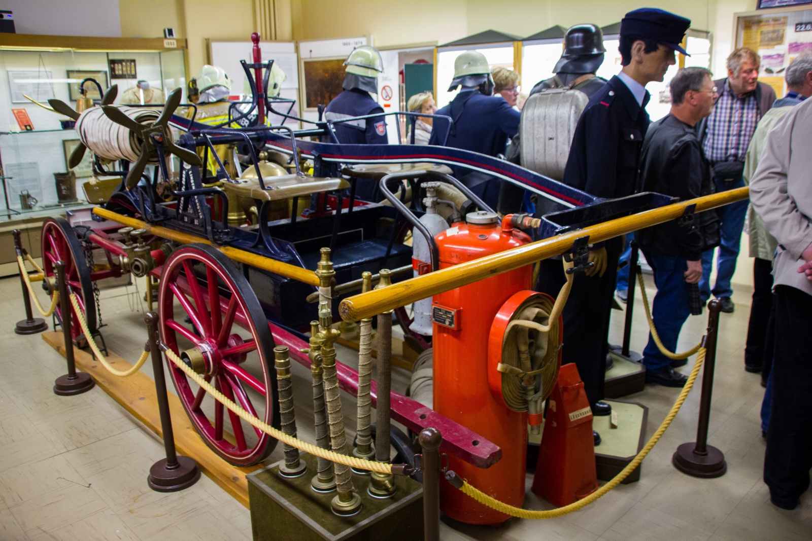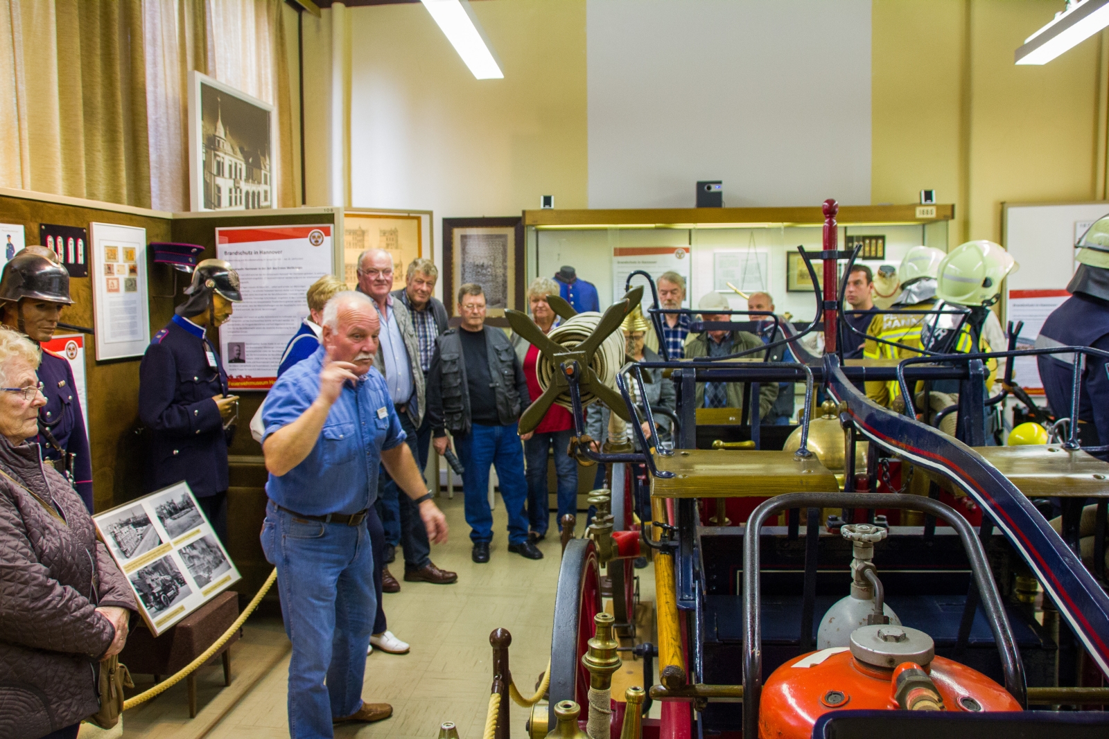 Aufgeteilt in zwei Gruppen wurden die ca. 1500 Exponate besichtigt. Sehr interessant war die Geschichte zu dem Horn des letzten hannoverschen Türmers. Bis 1907 besetzte ein Wächter den Turm der Marktkirche und hielt Ausschau nach Bränden. Entdeckte er einen Brand, blies er in das Horn um die Feuerwehr zu alarmieren. Damit die Feuerwehr wusste wohin sie fahren muss, wurde eine Fahne beziehungsweise nachts eine Lampe in die Richtung gehängt, wo das Feuer war. Auch ein weiteres Ausstellungsstück aus dem Jahre 1892, eine Handruckspritze die von Pferden gezogen wurde, zog viele Blicke auf sich und fand großes Interesse.
