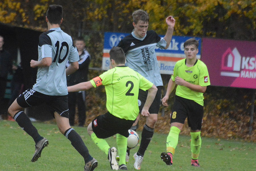 Ihren zweiten Sieg in Folge holten die A-Junioren der SG Grasdorf/Ingeln-Oesselse heute mit dem 2:1 bei der SG Hemmingen-Arnum. Den Führungstreffer der Gäste erzielte Piet Seemann mit einem nicht unhaltbaren Freistoß aus 22 Metern (22.), doch in der 36. Minute traf Siyawosch Farschbaf-Azari zum 1:1. Das Siegtor der SG Grasdorf/Ingeln-Oesselse resultierte wieder aus einem Freistoß von Piet Seemann, der Schuss aus etwa 25 Metern genau in den Torwinkel war unhaltbar (54.). Zu allem Überfluss sahen aus der Mannschaft der SG Hemmingen-Arnum Felix Burchhardt (61.) und Marius Lampe (90.) die rote Karte. Bei der Gästen ragten aus der geschlossenen Mannschaftsleistung Lukas Heinemann und Niklas Jung heraus.