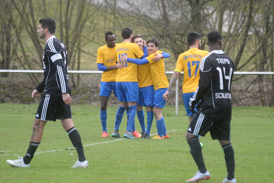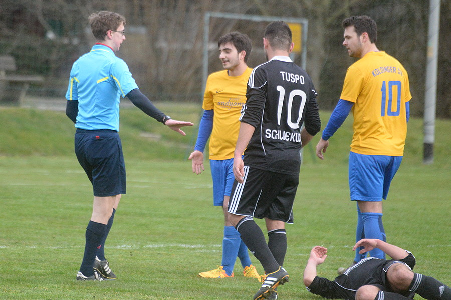 Da war mehr drin. Bezirksligist TuSpo Schliekum hat heute beim Tabellenführer Koldinger SV 1:2 (0:2) verloren, und einmal mehr ärgern sie sich darüber, dass die sich bietenden Einschussmöglichkeiten nicht genutzt worden sind. Die Gastgeber machten es besser, ihr Doppelschlag in der 25. und 28. Spielminute brachte ihnen durch die zwei Treffer von Pulido-Leon die 2:0-Führung ein. Danach trafen Selcuk Cetin und Joy Ledonne nur Latte und Pfosten des KSV-Tores. "Schade", sagt dazu TuSpo-Spielertrainer Imad Saadun. "Hier und heute lag für uns ein Punkt im Bereich des Möglichen, denn in der zweiten Halbzeit war es ein Spiel auf ein Tor – auf das der Koldinger." Nicht dabei bei den Gästen: Torwart Dennis Sniady – er musste aus beruflichen Gründen kurzfristig absagen. Das Tor für die TuSpo schoss Thomas Rohde in der 83. Spielminute.