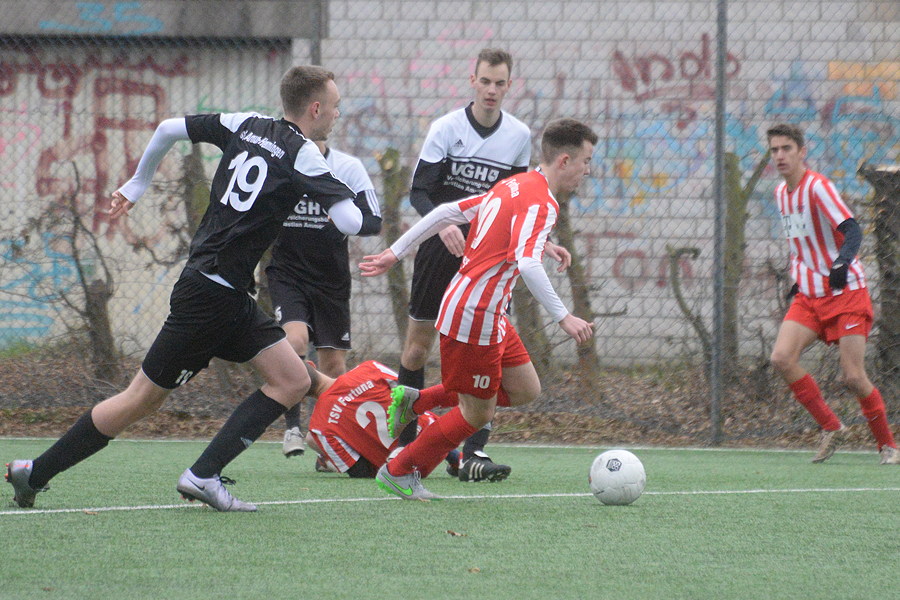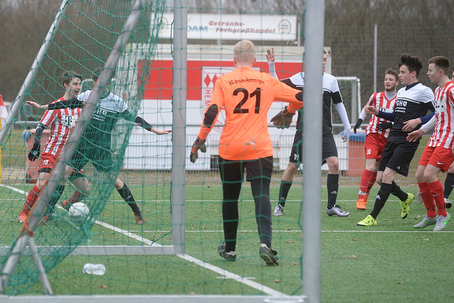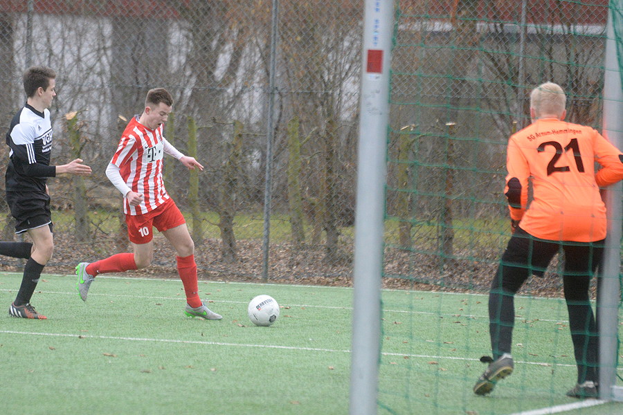 Im Heimspiel der Bezirksliga haben heute Mittag die A-Junioren der SG Hemmingen/Arnum wichtige Punkte im Kampf gegen den drohenden Abstieg liegen lassen. Gegen den TSV Fortuna/Sachsenross Hannover wurde 1:4 verloren. "Wir mussten heute fünf Spieler ersetzen, das war nicht zu kompensieren", sagte SG-Trainer Dirk Lautenbacher. Die Niederlage sieht er als in Ordnung an: "Der Gegner war cleverer als wir." Dabei waren die Gastgeber durch Marius Lampe 1:0 (23.) in Führung gegangen, aber beim Seitenwechsel führten die jungen Hannoveraner schon 2:1 nach zwei individuellen Fehler der Hemminger, und in der 2. Halbzeit kontrollierten sie das Geschehen.