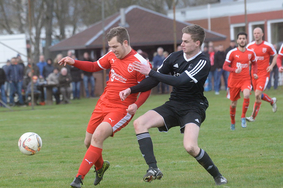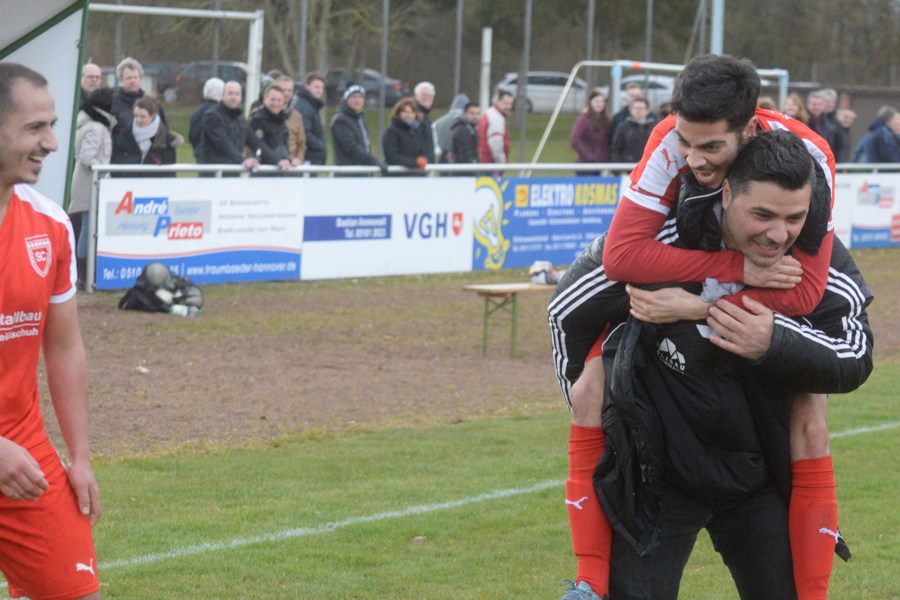Führungswechsel in der Staffel 3 der Kreisliga: Der SC Hemmingen-Westerfeld hat heute mit dem 1:0 (1:0)-Sieg bei Spitzenreiter SV Arnum die Tabellenführung übernommen, kann jetzt aus eigener Kraft Staffelmeister werden.. Nach dem Abpfiff ließen sich die Kicker des SC Hemmingen-Westerfeld von ihrem Anhang feiern, die Freude bei den Gästen war riesengroß. Denn nun können die Hemminger aus eigener Kraft die Meisterschaft gewinnen. Doch was die etwa 400 Zuschauer in den 90 Minuten davor zu sehen bekamen, war über weite Strecken alles andere als ein Spitzenspiel. Schuld daran war zum einen der holprige A-Platz der SV Arnum und zum anderen der starke Wind. Im ersten Durchgang hatten die Gäste den Wind im Rücken und so lief die Partie fast ausschließlich auf das Gehäuse der Gastgeber zu. Der Treffer zum 1:0 für den SC Hemmingen-Westerfeld durch Anfried de Vries in der 38. Minute sorgte für Gesprächsstoff: bei einer Flanke stiegen de Vries und SVA-Torhüter Michael Engelhardt hoch, beide konnten den Ball nicht richtig treffen, der Ball flog kerzengerade nach oben. Engelhardt ging zu Boden, de Vries blieb stehen und bugsierte den herunterfallenden Ball dann ins Arnumer Tor zur Führung. Es war nicht ganz eindeutig, ob der Zweikampf im Fünfmeterraum war oder nicht. Der umsichtige Schiedsrichter Ferhat Kiy entschied auf Tor, auch wenn die Spieler der SV Arnum lautstark protestierten. Im zweiten Durchgang sahen die Zuschauer ein besseres Spiel, mit Rückenwind machten die Hausherren nun Druck und kamen zu mehreren guten Tormöglichkeiten. Die größte Chance vergab Felix Rademacher in der 80. Minute als er per Seitfallzieher aus kurzer Distanz nur den Innenpfosten traf. Auch Nick Hieronymus und Lars Jordan hatten noch gute Chancen, trafen aber jeweils nicht das Tor. Auf der anderen Seite hätte Michael Gerlach das Spiel vorzeitig entscheiden können, doch in der 61. Minute traf er aus zehn Metern das leere Tor nicht, in der 86. Minute rettete ein Arnumer Spieler auf der Linie nach seinem Schuss. Einen negativen Höhepunkt gab es nach dem Abpfiff: Arnums Torhüter Michael Engelhardt sah nach einer groben Unsportlichkeit gegenüber dem Schiedsrichter die rote Karte. "Ich bin natürlich enttäuscht, aber wir haben das Hinspiel auch verloren und standen am Ende der Hinrunde vor den Hemmingern, warum soll das jetzt nicht auch so laufen. Es war klar, dass unsere Siegesserie irgendwann reißen würde. Für uns ist das kein Beinbruch, nur die rote Karte wird uns weh tun, das war höchst überflüssig", sagte SVA-Trainer Tobias Brinkmann nach der Partie. Für Semir Zan, Trainer des SC Hemmingen-Westerfeld, war es eine verdienter Sieg seiner Mannschaft: "Bis auf die 25 Minuten nach der Halbzeit hatten wir das Spiel im Griff und hätten den Sieg schon früher klar machen können. Für die Zuschauer war es sicherlich kein Leckerbissen, aber für uns war es natürlich ein extrem wichtiger Sieg auf dem weg zur Meisterschaft."