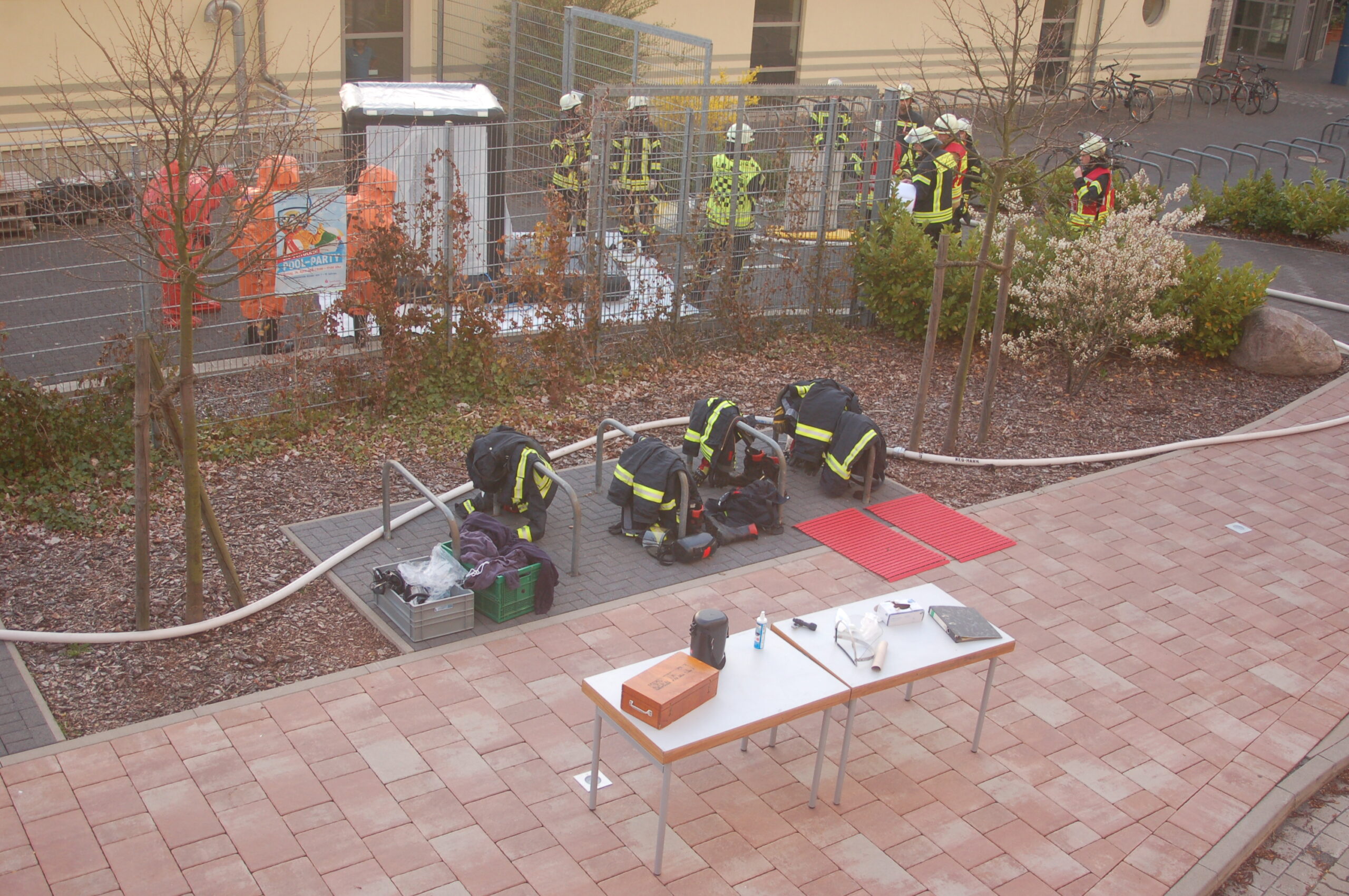 Nach einer kurzen Erkundung durch den Zugführer-ABC und einem geschulten Blick in die Einsatzunterlagen werden die ersten Kommandos erteilt. Drei Feuerwehrleute in Chemikalienschutzanzügen (CSA) rüsten sich aus und betreten gegen 19.28 Uhr zuerst den von außen zugänglichen Chlorgasraum, in dem die Flaschen stehen. Anschließend steigen sie die Treppe in den Keller herunter. Dort werden in völliger Dunkelheit die drei Vermissten (drei schwere Dummys) gesucht und anschließend ins Freie getragen. In einer mobilen Dekontaminationsdusche werden die geretteten Personen als auch die Helfer nach dem Einsatz gründlich gereinigt. Da es sich um eine Übung handelt, werden diese Arbeiten zwar mit gebotener Sorgfalt aber nur "trocken" durchgeführt.