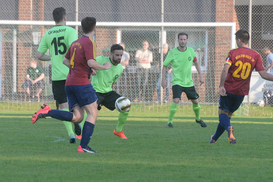 Durch einen Foulelfmeter in der 90. Minute durch Jan Hentze zum 2:2 hat der SV Germania Grasdorf weiterhin die Chance auf den Klassenerhalt gewahrt.. Beim Wiederholungsspiel heute Abend gegen den Mühlenberger SV – das Nachholspiel vor zwei Wochen wurde wegen einsetzender Dunkelheit in der 85. Minute beim Stand von 2:0 für die Germania abgebrochen – sah es lange nach einem Sieg der Gäste aus. Bis Mateos Abazaj in der 89. Minute im Strafraum umgrempelt wurde und Jan Hentze den Strafstoß sicher verwandelte.