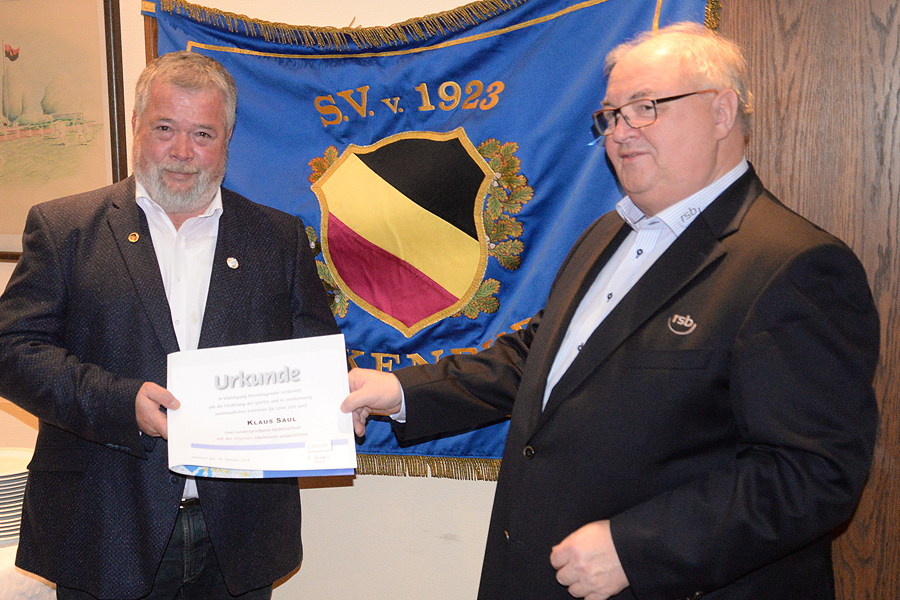 Klaus Saul, seit 2004 der 1. Vorsitzende des SV Wilkenburg, ist heute Abend im Vereinsheim des SV Wilkenburg mit der Silbernen Ehrennadel des Landessportbundes ausgezeichnet worden. Die Ehrung hat Joachim Brtandt, Vorsitzender des Regionssportbundes, vorgenommen. den entsprechenden Antrag hatte der Verein gestellt.. Klaus Saul hat 1993 als Sportwart und Kassierer in Personalunion seine ehrenamtliche Aktivität begonnen. Streng genommen war das schon fünf Jahre zuvor, als Steuerberater Saul auf Bitten das damaligen 1. Vorsitzende Friedhelm Gösel die Buchführung des Vereins übernommen hat. Sportwart war Saul bis 1997, Kassierer bis 1998 und noch einmal von 2000 bis 2004. Mitglied ist Klaus Saul im SV Wilkenburg inzwischen seit 40 Jahren.