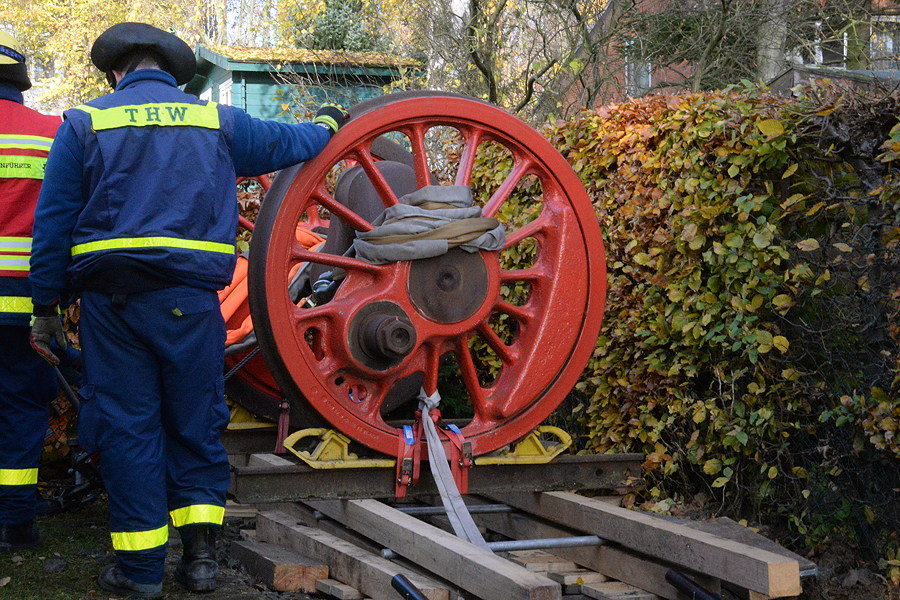 Das war ein ungewöhnlicher Auftrag für das Technische Hilfswerk (THW) in Sarstedt: Aus dem Garten eines Reihenhauses im Föhrenweg galt es die zwei Teile einer Güterzuglokomotive aus der Baureihe BR044 abzuholen und zum Sarstedter Bahnhof zu transportieren. Der im August verstorbene Hausbesitzer hat diese Teile der Stadt Sarstedt vermacht.. Die Rauchgasklappe sowie die gekröpfte Achse der Lokomotive haben beziehungsweise werden auf Wunsch des Verstorbenen, Friedrich-Wilhelm Hanne, nun einen neuen Platz bekommen, nämlich am Bahnhof Sarstedt. Für beide Teile musste das THW einen Kran zum Einsatz bringen, die Aktion hat mehrere Stunden in Anspruch genommen. Der städtische Bauhof hat am Bahnhof die entsprechenden Vorbereitungen getroffen und unter anderem ein Gleisbett nachgebaut, die gekröpfte Achse steht bereits, die Rauchgasklappe wird ein paar Tage später installiert und bis dahin auf dem Bauhofgelände zwischengelagert. Es war Hannes Wunsch, dass das THW in diese Aktion eingebunden wird.