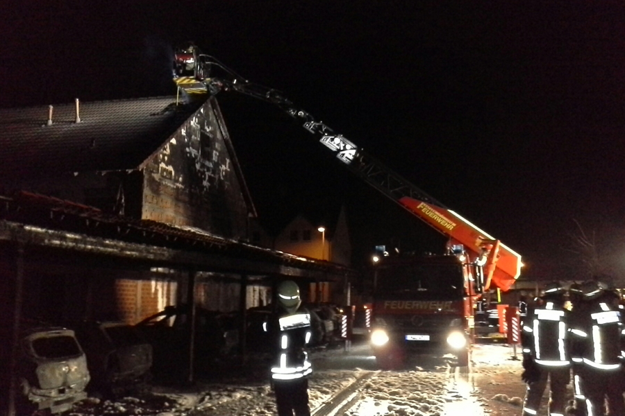 Großfeuer in Rethen zerstört Carport und 14 Autos