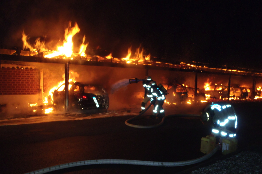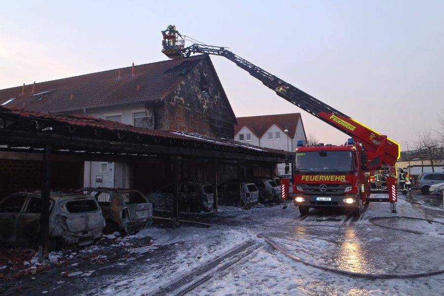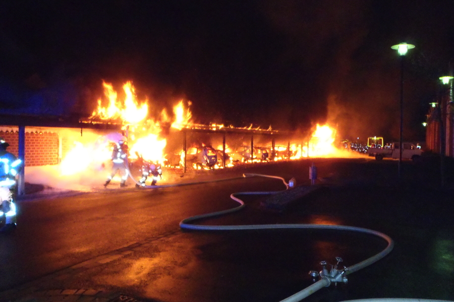 Um 2.35 Uhr wurde heute Morgen die Ortsfeuerwehr Rethen in die Straße „Zur Sehlwiese“ alarmiert, dort standen mehrere Personenwagen in einem offenen Carport in Flammen. Bei Eintreffen der ersten Kräfte brannten insgesamt 14 Autos und der Carport. Alles stand auf einer Länge von etwa 50 Metern in „Vollbrand“. . Wenige Minuten später wurde die Alarmstufe auf "B2" erhöht und die Ortsfeuerwehren Gleidingen und Laatzen nachalarmiert. Mit fünf C-Rohren, zwei B-Rohren und zwei Schaumrohren bekämpften zahlreiche Trupps unter Atemschutz die Flammen. Bei drei weiteren Wagen gegenüber auf dem Parkplatz schmolzen wegen der großen Hitze die vorderen Bereiche. Über einen Stichweg im Wohngebiet hinter den Carports wurde über die Drehleiter gelöscht. Ein unmittelbar angebautes Reihenendhaus konnte von außen gekühlt werden, Flammen schlugen aber in das Dachgeschoss und die Dämmung brannte lichterloh.