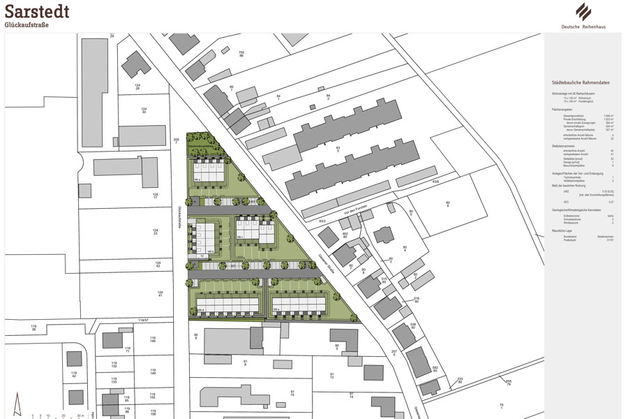 Die Deutsche Reihenhaus AG baut zum ersten Mal in Sarstedt. Auf einer 8000 Quadratmeter großen Fläche an der Ecke Giesener Straße/Glückaufstraße entstehen 26 Einfamilienhäuser in serieller Bauweise. Der Kölner Bauträger investiert in den Wohnpark „Glückaufstraße“ 7,2 Millionen Euro. . Dazu Vorstand Carsten Rutz: "Das Wohnen im Landkreis Hildesheim gestaltet sich für junge Familien heutzutage längst nicht mehr so entspannt wie noch vor einigen Jahren. Vor allem in Sarstedt fehlen Angebote für bezahlbares Eigentum mit familienfreundlicher Infrastruktur. Deswegen freuen wir uns sehr, nun auch jungen Menschen und ihren Kindern hier ein Angebot machen zu können. Wir werden auch hier der preiswerteste Anbieter für Wohneigentum im Neubau sein."