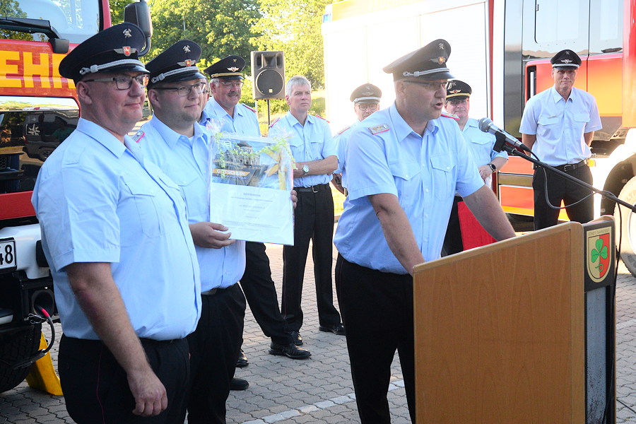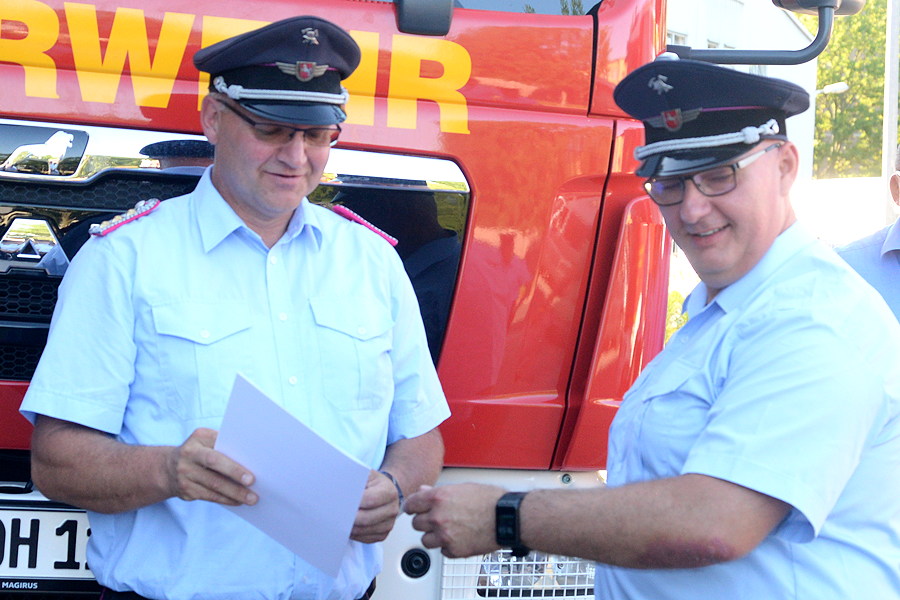 Rüdiger Schulz kam gestern jedoch noch zu einer, wenn auch letzten, Amsthandlung als Stadtbrandmeister: er beförderte Jens Klug vom Hauptbrandmeister zum 1. Hauptbrandmeister.