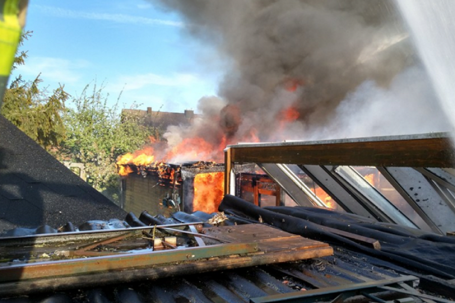 In der Straße Im Mittelfeld in Giebelstieg ist gestern am frühen Abend eine Fahrradwerkstatt in Flammen aufgegangen, auch das angrenzende Wohnhaus wurde dabei in Mitleidenschaft gezogen.. Das Einsatzstichwort für die Wehr lautete zunächst "B1 – Gartenlaube" in der Straße Im Mittelfelde. Schon während der Anfahrt wurde nach Rücksprache mit der Leitstelle aufgrund der von Weitem sichtbaren Rauchsäule und der hohen Anzahl an eingehenden Anrufen bei der Leitstelle auf das Stichwort "B1 – Wohnhausbrand" gewechselt und so weitere Kräfte nachalarmiert. Vor Ort stellte sich heraus, dass das von einem Holzanbau ausgehende Feuer bereits dabei war, auf das Wohnhaus überzugreifen.