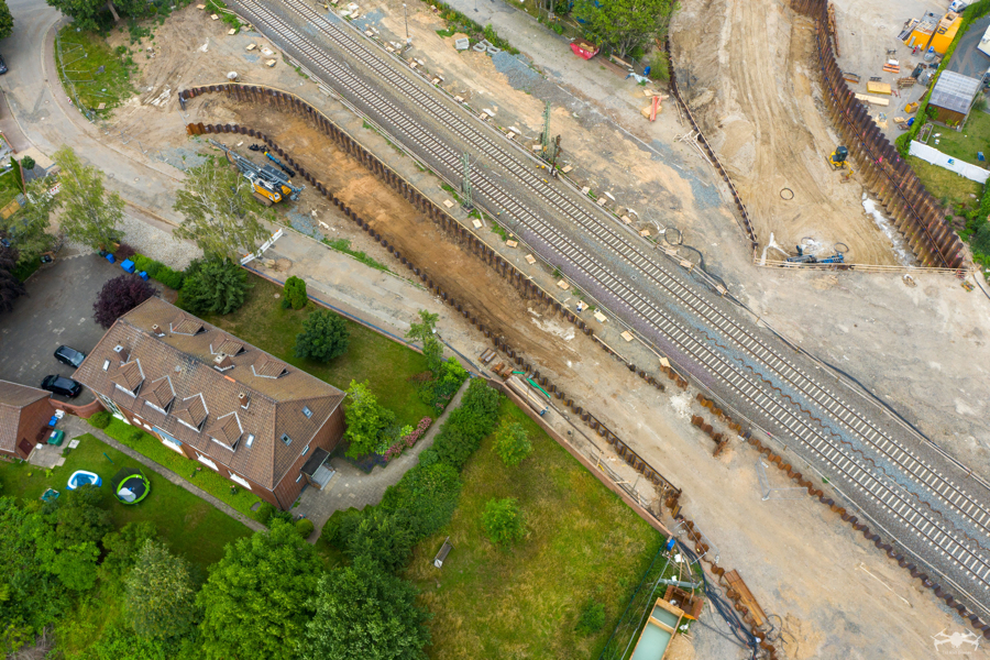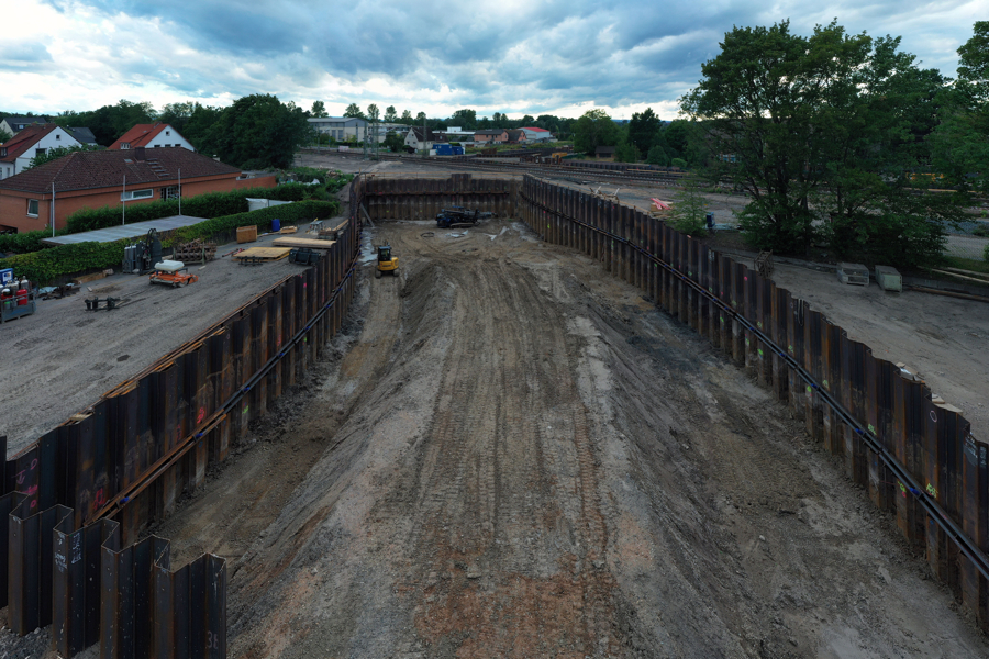 Die Arbeiten auf der Baustelle zur Bahnüberquerung an der Friedrich-Ludwig-Jahn-Straße schreiten voran. An der Ostseite, im Bereich der Ladestraße, werden Ankerarbeiten, gefolgt von der Betonage der Gründungssohle bis voraussichtlich zum 17. Juli stattfinden. Vom 20. Juli an starten dann die Schal- und Bewehrungsarbeiten für die Betontrogsohle.