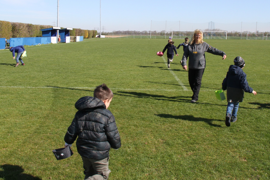 Die Kinder im Alter von einem bis etwa 13 Jahren konnten es kaum abwarten, endlich den Platz zu stürmen und Ostereier, Osterhasen oder andere kleine Überraschungen einzusammeln, die der Osterhase morgens auf dem großen Fußballfeld verteilt hatte.
