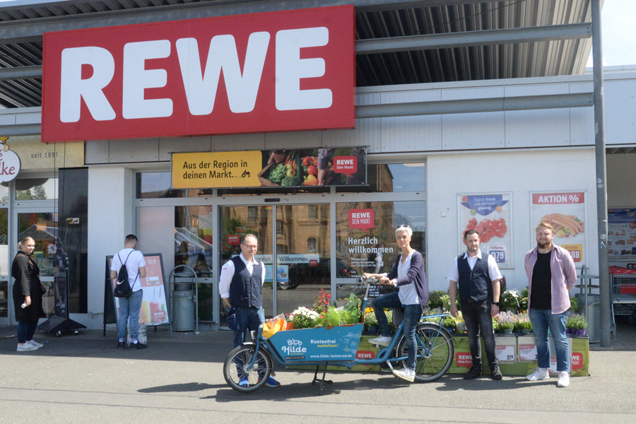 Wir "Clothilde" überhaupt nach Sarstedt gekommen ist? Kerstin Sobania, Klimaschutzmanagerin im Sarstedter Rathaus, hatte im Rahmender Aktion STADTRADELN von diesem Lastenfahrrad gehört und Kontakt zum ADFC aufgenommen. "Nachdem wir den Zuschlag bekommen haben, setzte ich mich mit dem REWE-Markt in der Voss-Straße als Standort in Verbindung und bekam den Zuschlag", sagte sie heute Mittag bei der Vorstellung von "Clothilde" vor dem REWE-Markt. Zusammen mit Marktleiter Alexander Lippert und seinem Stellvertreter Thorsten Neumann wurde das Lastenfahrrad seiner Bestimmung übergeben.
