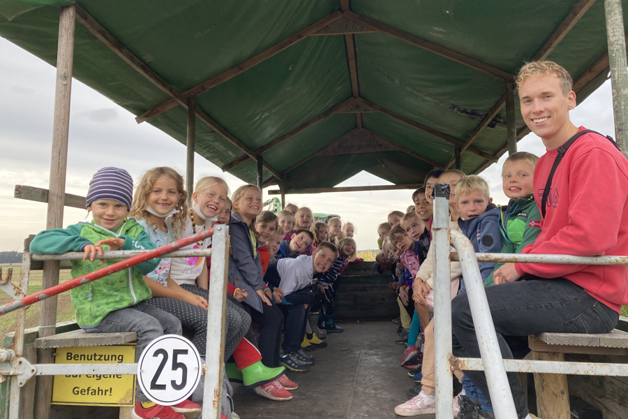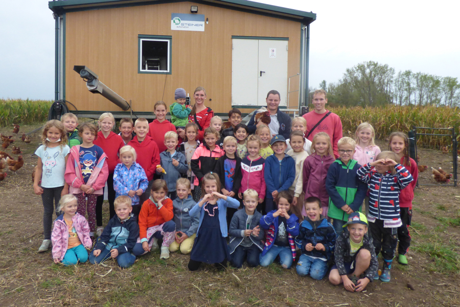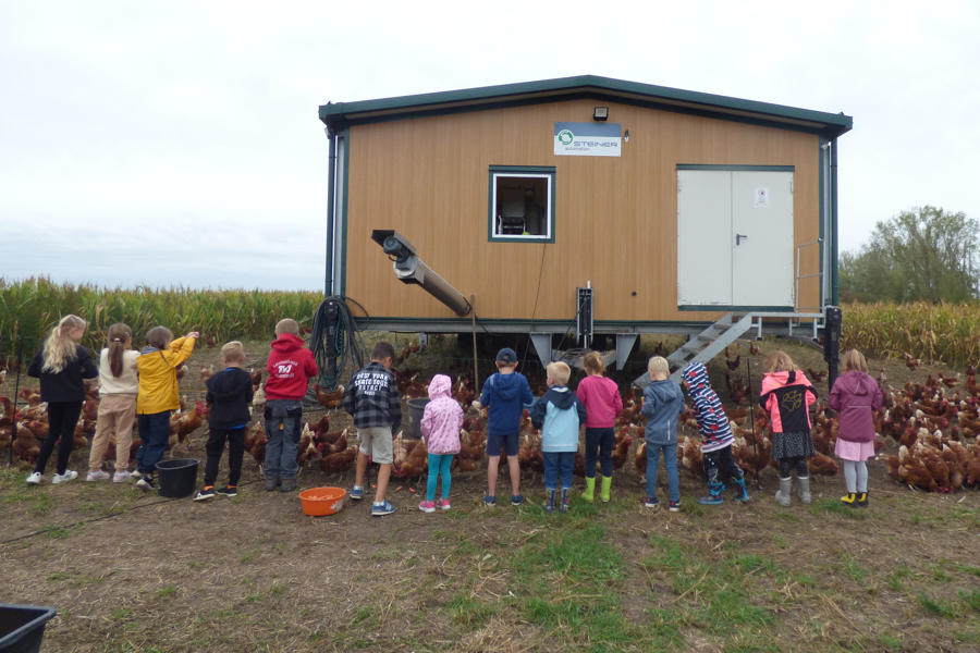 Nach der Begrüßung ging es vom Hof für alle Kinder auf einem Anhänger sitzend und vom Trecker gezogen raus in die Feldmark, wo zwei mobile Hühnerställe mit etwa 1000 Hühnern zu erleben waren. Zunächst wurden den Kindern alle Futtermittel erklärt, in großen Mengen standen Körbe und Kisten mit Möhren, Mais, Weizenkörnern und Brötchen bereit. Alles durfte an die Hühner verfüttert werden, die mit sichtlichem Appetit sich den Gästen näherten – ein Huhn muss am Tag 5000mal picken.