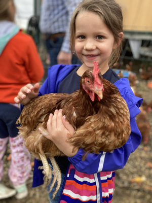 In Kleingruppen wurde auch ein Blick in den mobilen Hühnerstall geworfen. Dort gab es die Möglichkeit, die frisch gelegten Eier direkt einzusammeln. Auch die Junghennen, die das Eierlegen von den großen Hühnern noch lernen müssen, waren ebenfalls im Stall untergebracht. Heinrich Hennies, Seniorchef des Betriebs, kam mit den Kindern über die Hühner ins Gespräch und verteilte kurzerhand mutigen Kindern auch die ein oder andere Henne auf den Arm. Gar nicht so leicht, diese zarten Flügel fest anzupacken, aber ganz weich ist es über die Federn zu streicheln. Wenn ein Huhn doch mal entwischte waren das begleitende Trainerteam bestehend aus Jannik Ostwaldt und Ann-Kathrin Harmening beim Einfangen gefragt. Beide haben zwischendurch auch einen "Eierlauf" angeboten, damit ein bisschen Bewegung für die sportbegeisterten Kinder an dem Nachmittag nicht fehlte.