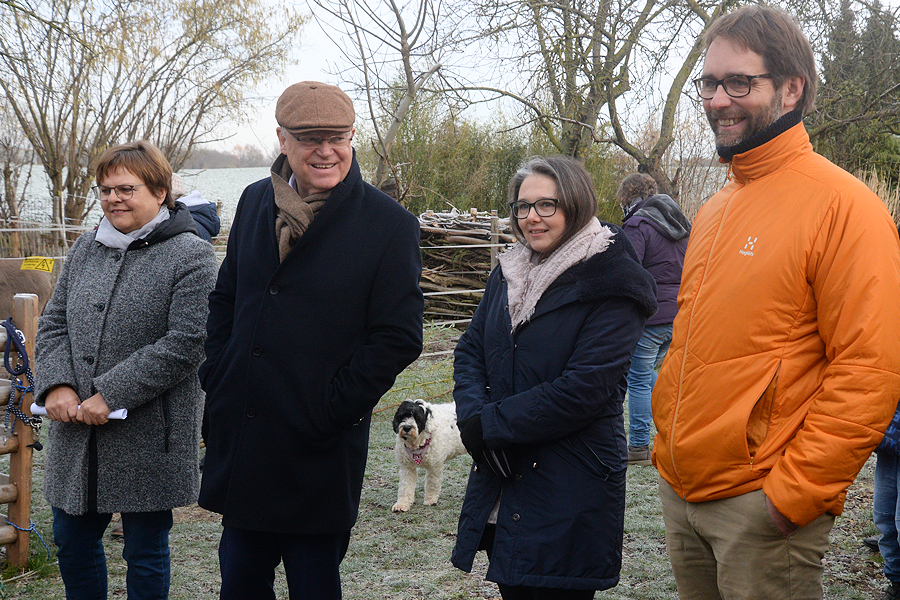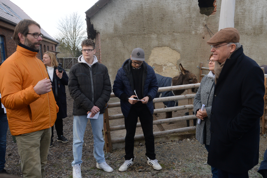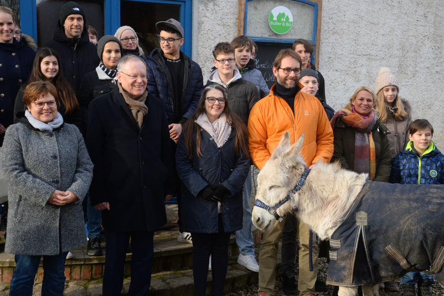 Niedersachsens Ministerpräsident Stefan Weil hat heute Vormittag den Erlebnisort Buller&Bü in Schulenburg besucht, und er war nach seinem knapp einstündigen Aufenthalt von dieser „grünen Einrichtung“ beeindruckt. . "Selbst Eseldreck wegräumen kann einen pädagogischen Wert haben." Das sagte Steffen Lebjedzinski unter anderem zu Stefan Weil. Dieses, und noch vieles mehr bekam der Ministerpräsident mit auf den Weg. Steffen Lebjedzinski und seine Ehefrau Carolin haben vorn zwei Jahren diese "grüne Einrichtung" gegründet, davor einige Jahre das vom Erbprinz von Hannover erworbene Areal saniert. "Hier wohnten früher die Arbeiter der Domäne mit ihren Familien." Es habe bei Buller&Bü eine unfassbare gute Entwicklung gegeben. "Wir hatten die Vision, einen Ort zu schaffen, wo wir mit Menschen arbeiten können und die wir umgesetzt haben."