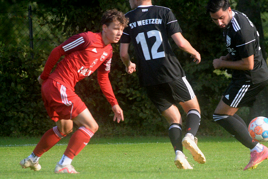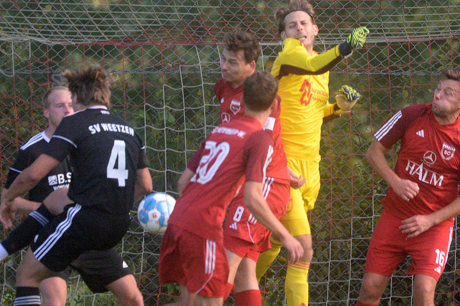 3:1 beim SV Weetzen gewonnen: Der SC Hemmingen-Westerfeld hat sich auch in seinem 6. Saisonspiel schadlos gehalten, den sechsten Sieg eingespielt. Und setzt damit die Verfolger unter Erfolgsdruck. Mit dem Egebnis zeigt sich Benny Weisschuh, Trainer des Tabellenführers, durchaus zufrieden, weniger mit der gezeigten Leistung. "Spielerisch war das von uns heute nicht gut", lautet seine Bilanz nach dem Spiel. Aber am Ende hat es beim SV Weetzen zum 3:1 (2:1)-Sieg gereicht. Bereits in der 3. Spielminute traf Ian Kluw zum 0:1, und nur wenige Minuten danach bot sich Deniz Berk die Möglichkeit zum 0:2, aber er scheiterte mit dem an Guliano Pisani verursachten Strafstoß am Torwart des Gegners. Das 0:2 (32.) geht dann aber auf das Konto von Deniz Berk, aber der SV Weetzen ließ nicht locker, kam in der 40. Spielminute zum 1:2. Den Schlusspunkt setzte Tom Brauer mit seinem Tor zum 1:3 in der Schlussminute. "Das war das erwartet harte Stück Arbeit", fasst Benny Weisschuh die 90 Spielminuten an der Weetzener Bröhnstraße zusammen. "Aber verdient gewonnen haben wir allemal."