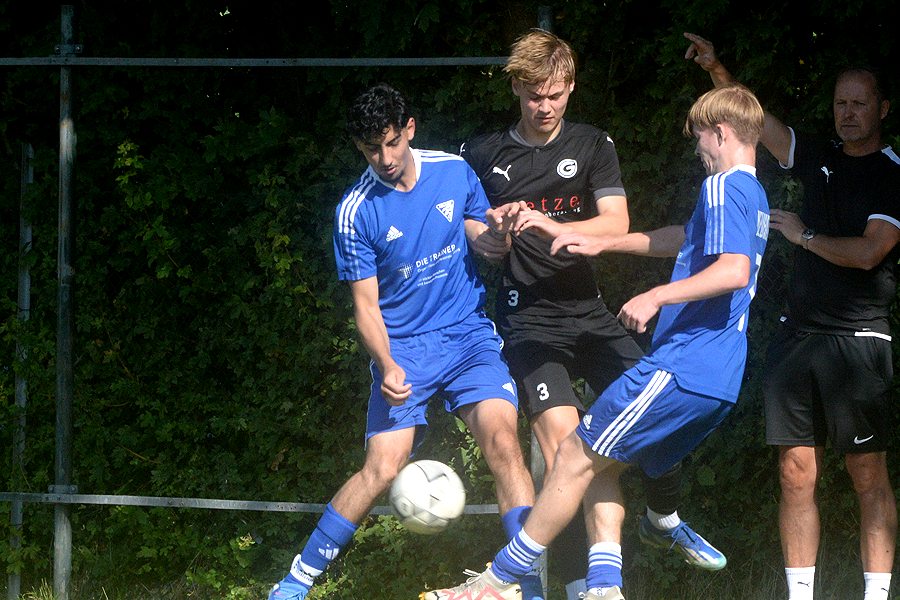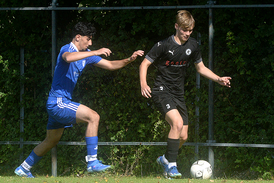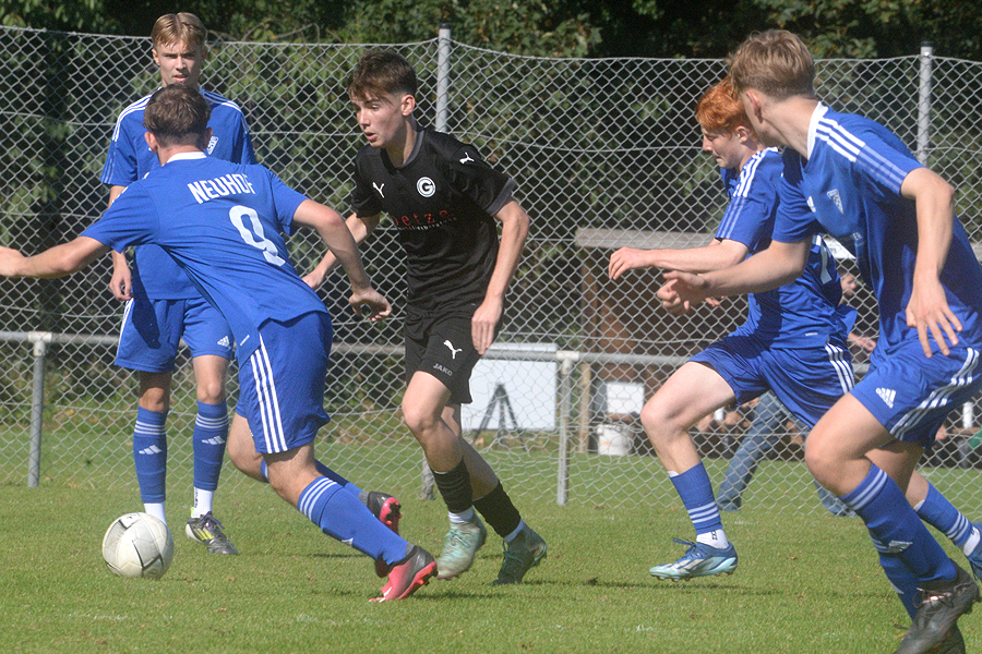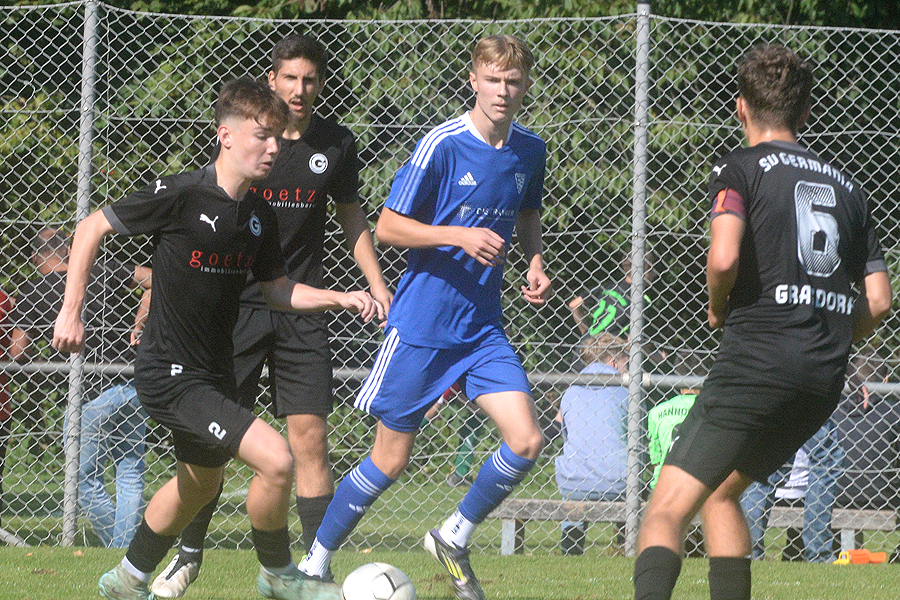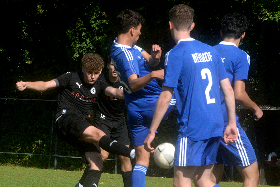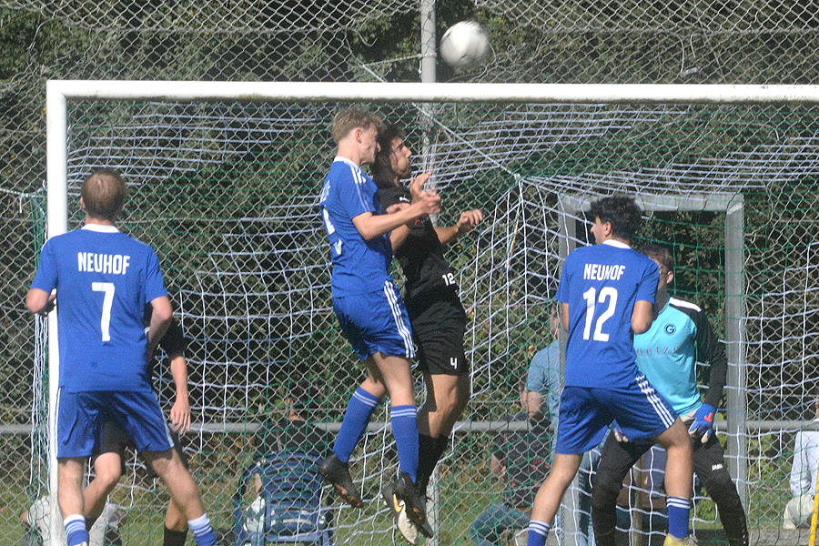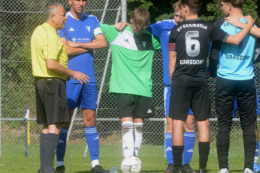 A-Junioren-Bezirksliga: Mit dem Heimspiel gegen den SV Blau-Weiß Neuhof strebte der SV Germania Grasdorf den fünften Sieg im fünften Saisonspiel an, und das hat nicht funktioniert, beim Schlusspfiff stand es 1:1 (0:0). Erst drei Minuten vor Spielende traf Noel Vences zum 1:1, und rettete damit den Germanen wenigstens einen Punkt, die Blau-Weißen aus dem Hildesheimer Stadtteil waren in diesem intensiven Spiel nach 56 Minuten in Führung gegangen. "Letztlich war es glücklich, aber wir haben in der ersten Halbzeit Chancenwucher betrieben", sagt Rene Türk, Trainer der Grasdorfer Germania. "Der Gegner war robust, hat viel Einsatz gezeigt, und wir sind nicht wirklich ins Spiel gekommen."