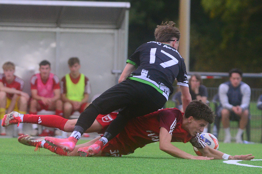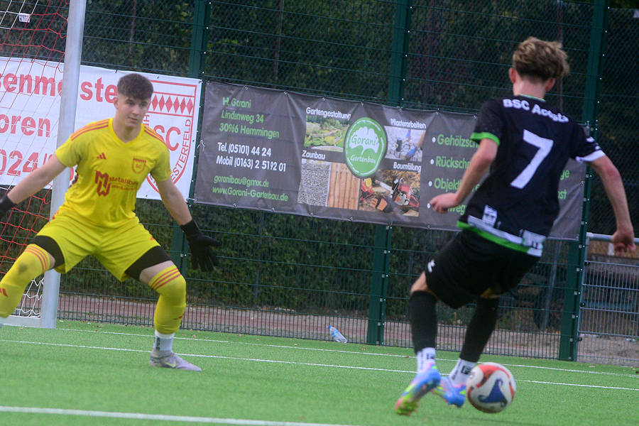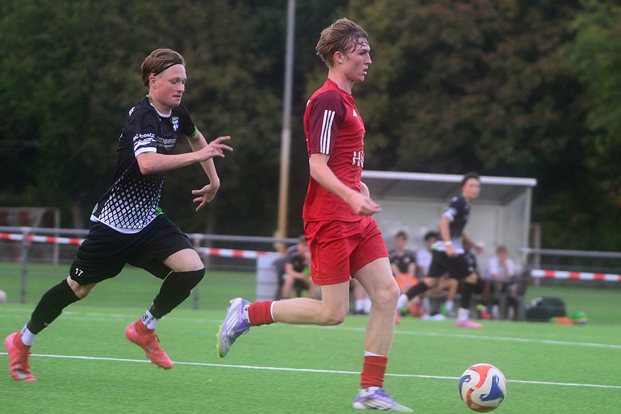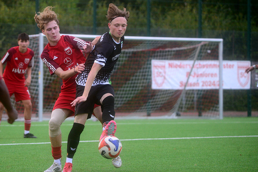 A-Junioren-Niedersachsenliga: Mit dem BSC Acosta Braunschweig hatte der SC Hemmingen-Westerfeld das Tabellenschlusslicht an der Hohen Bünte zu Gast, ging als Favorit auf die drei Punkte in dieses Heimspiel, ist aber über das 2:2 (2:0) nicht hinaus gekommen. Von Beginn an entwickelte sich ein Spiel in eine Richtung – auf der Tor der Gäste. Allerdings bot sich den Löwenstädtern eine ganz dicke Konterchancen zur Führung. Aber folgerichtig gingen die SCer durch Fiete Hartwig 1:0 (25.) in Führung, und das Eigentor (32.) der Gäste brachte das 2:0 ein. Im zweiten Spielabschnitt traf jedoch nur noch der BSC Acosta (60. und 86.), die SCer gingen leer aus, damit stand beim Schlusspfiff das 2:2. „Mit den ersten 45 Minuten bin ich sehr zufrieden, aber danach haben wir alles vermissen lassen, was wir zuvor gezeigt haben“, zeigt sich SC-Trainer Marco Dubberke kritisch. „Eine gute Halbzeit reicht in dieser Liga nicht für den Sieg. Der Gegner hatte praktisch keine Torchance, seine zwei Tore sind aufgrund individueller Fehler von uns gefallen. Für mich fühlt sich das Ergebnis wie eine Niederlage an. Wir müssen das Niveau der ersten Halbzeit über neunzig Minuten auf den Platz bringen.“
